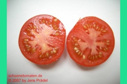 Aufbinder - mittelgroße Pflanze (bis 2 m) früher Erntebeginn (Anfang August) geringer Ertrag (in besseren Jahren sicher mehr) mittelgroße (ø 5 cm), runde, hellrote Früchte. normaler, unauffälliger Geschmack platzfest (Quelle: www.schoenetomaten.de)