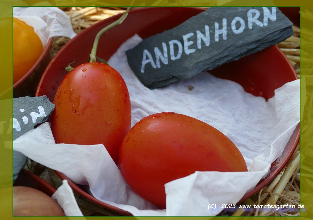 Andenhorn ist eine der Tomatensorten, die wir jedes Jahr ziehen und im Freiland unter Regendach auspflanzen.