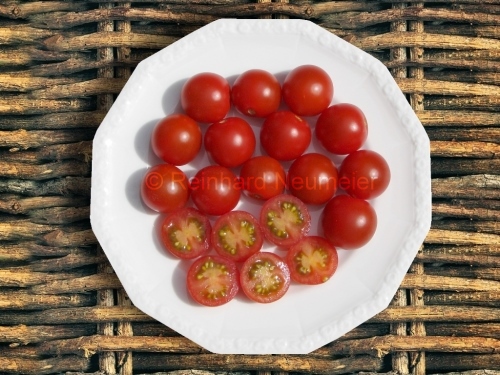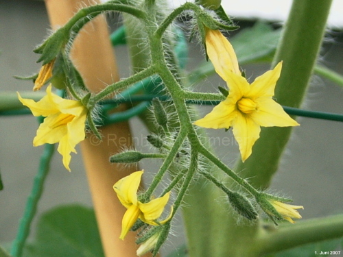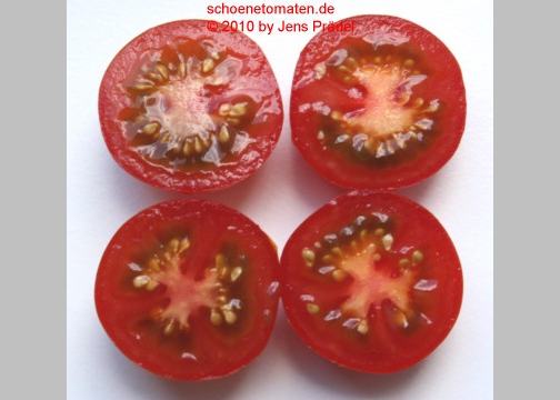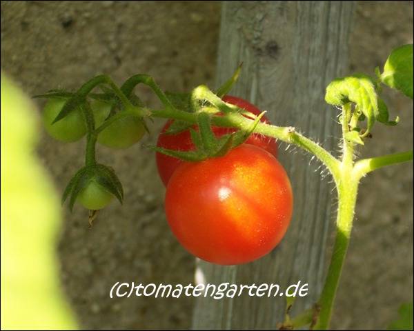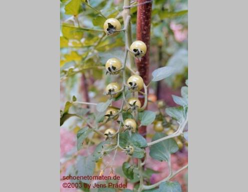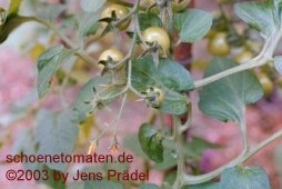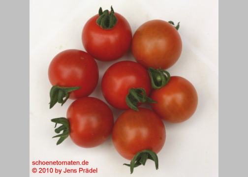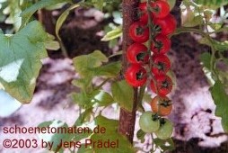 Arcadia - sehr große Pflanze (bis 2,5 m) früher Erntebeginn (Anfang August) reicher Ertrag kleine (ø max. 3 cm), runde, rote Früchte schöne gleichmäßige Rispen süße, leckere Früchte (Quelle: www.schoenetomaten.de)