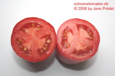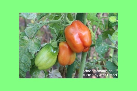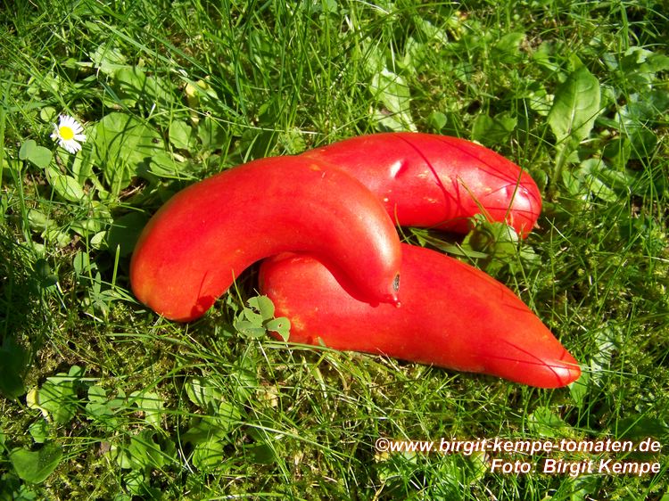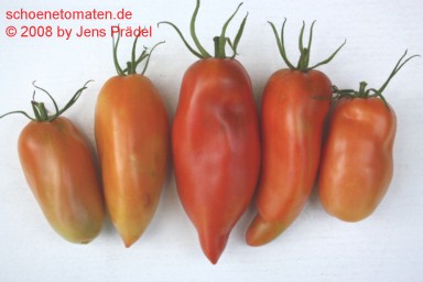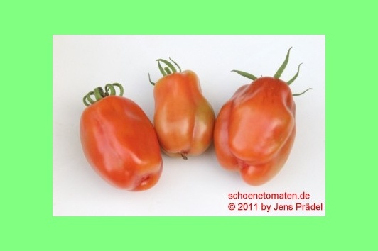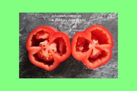 mittelgroße, beutel- oder paprikaförmige bis unregelmäßig geformte (meist 6 cm lang und 4,5 cm breit, aber auch 6 cm lang und 8 cm breit), meist leicht gerippte, dunkelrote Früchte