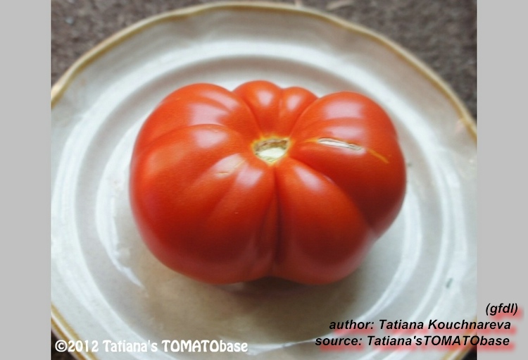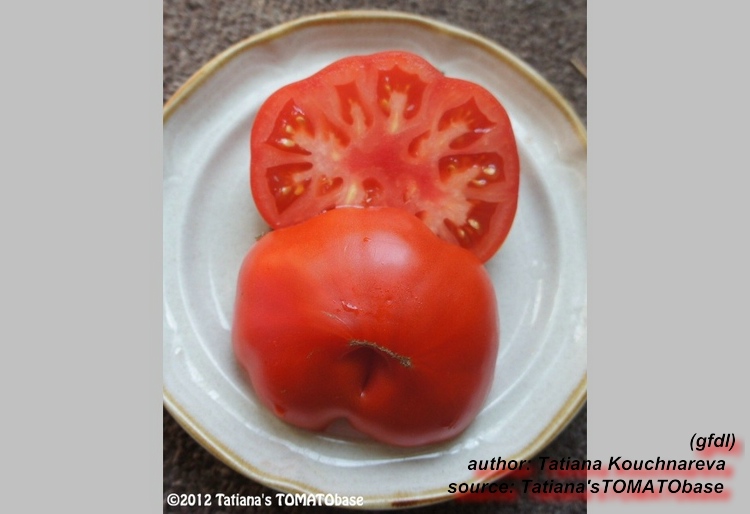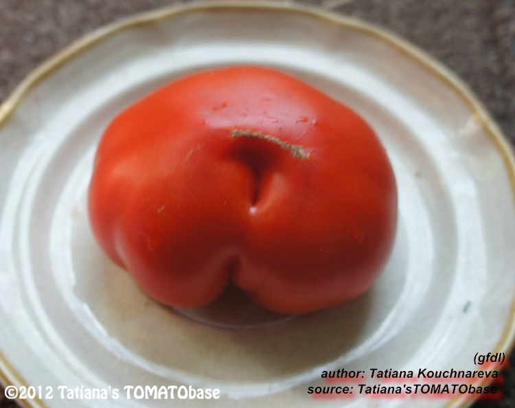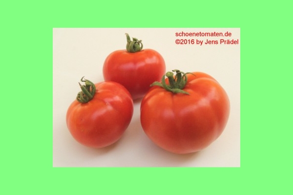 große (ø 6,5 bis 7 cm und 4 bis 4,5 cm hoch), 60 bis über 100 g schwere, schön gleichmäßig breitrunde, nur leicht gekerbte, rote Früchte