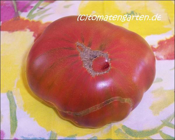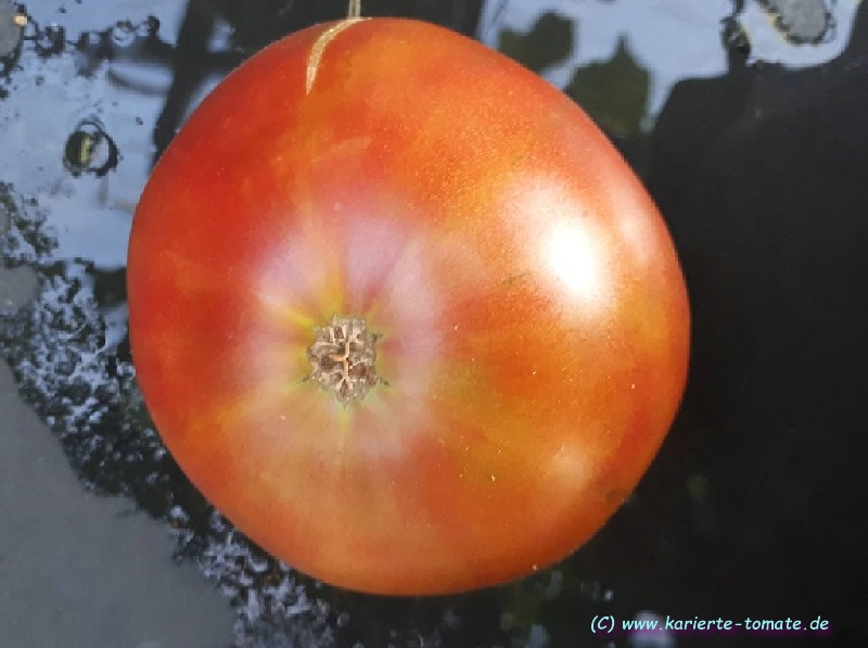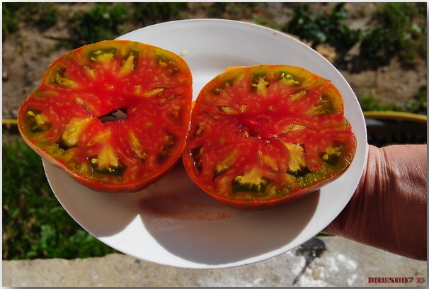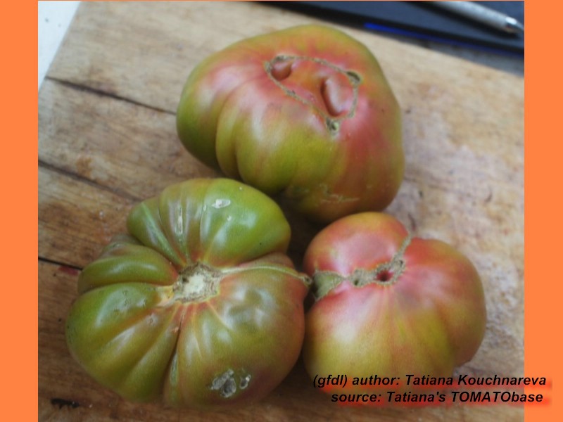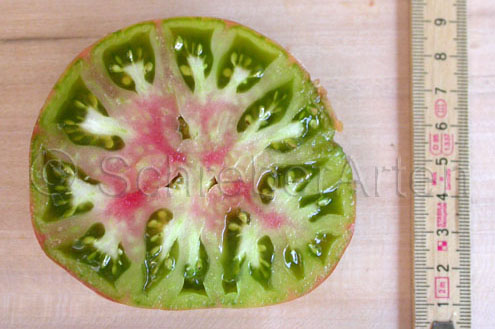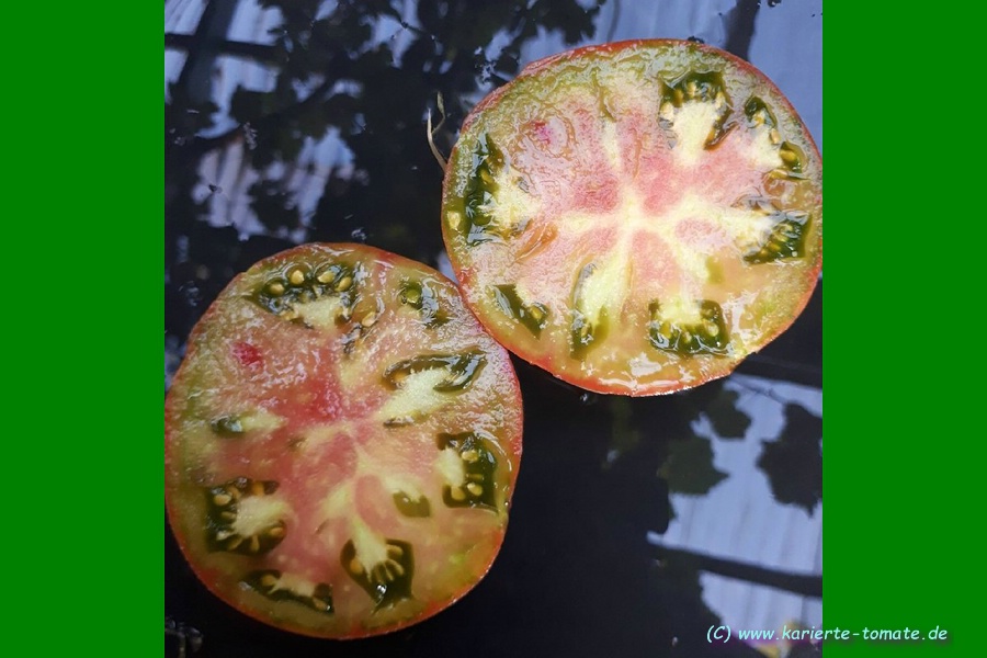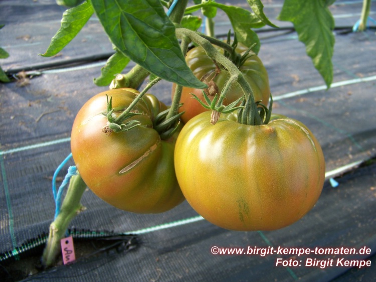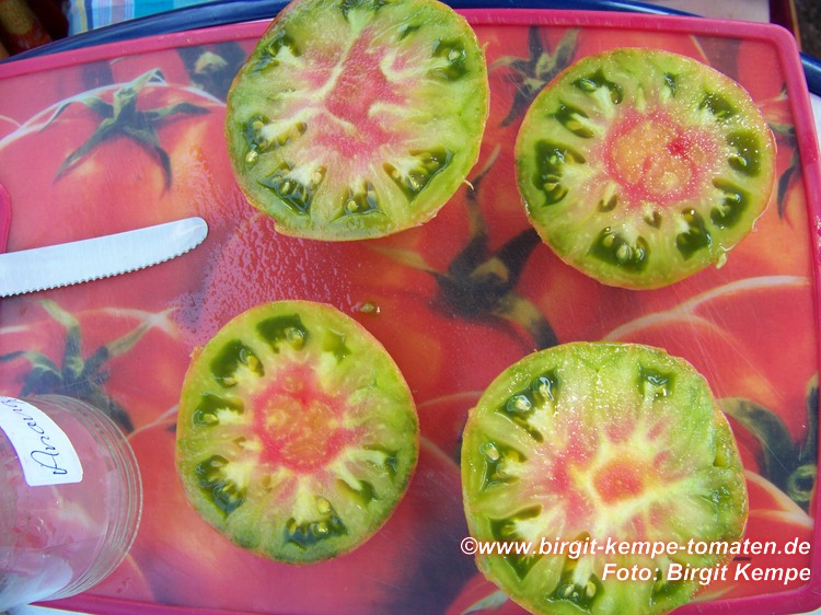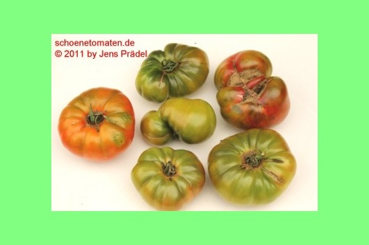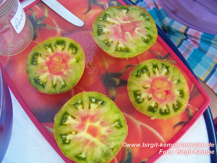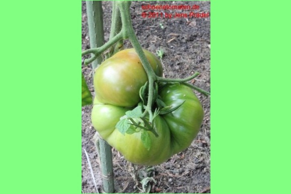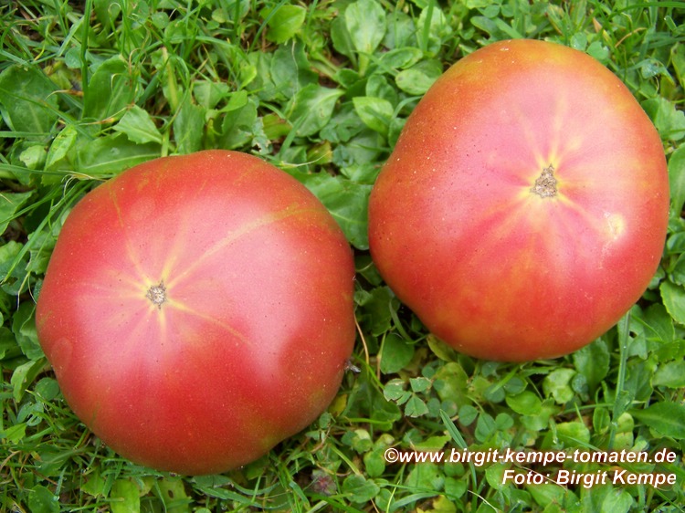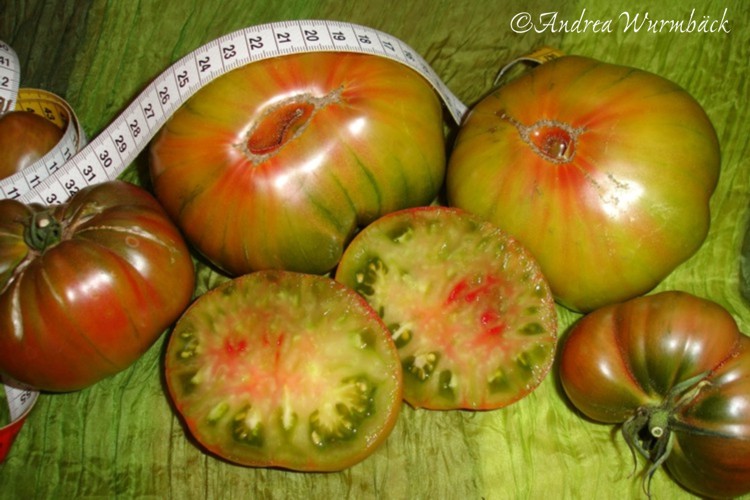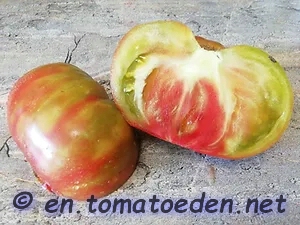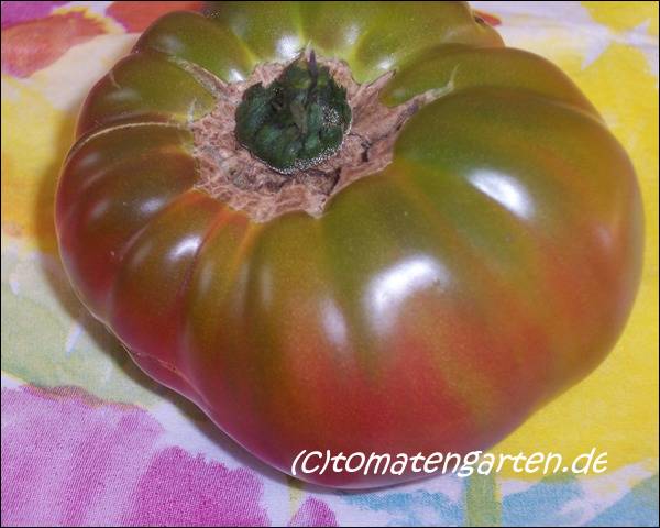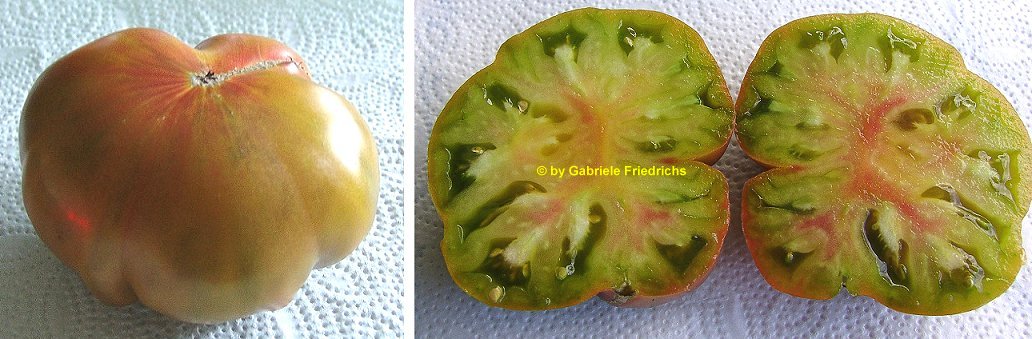 Sehr große, extrem breitrunde, im Kragenbereich etwas gerippte, grün-rote Früchte, die aufgeschnitten in den gleichen Farben marmoriert sind. Manche Früchte sind auch komplett rot durchgefärbt.