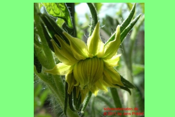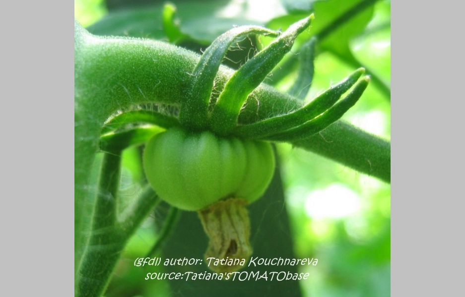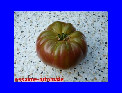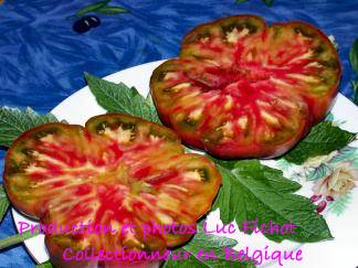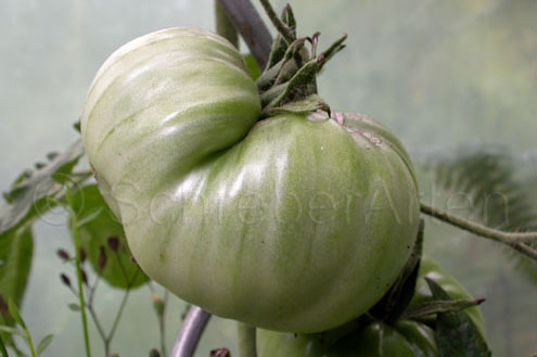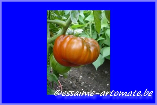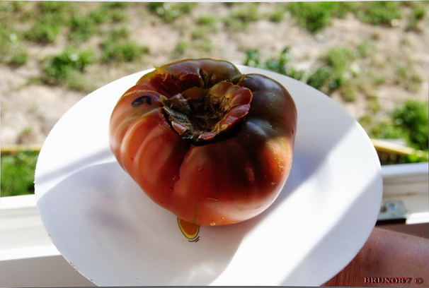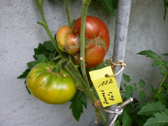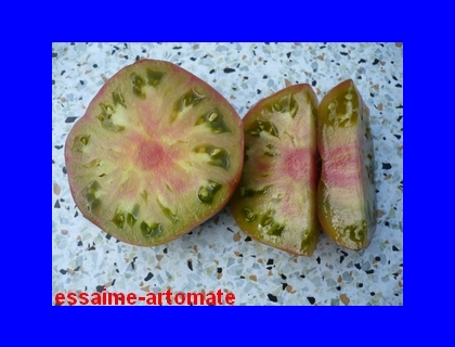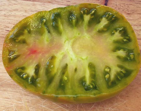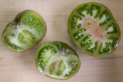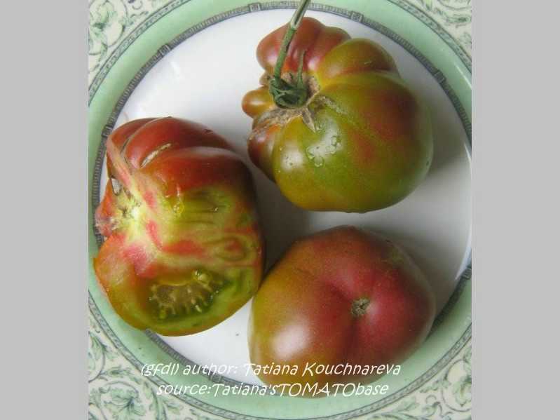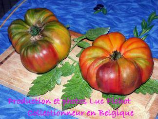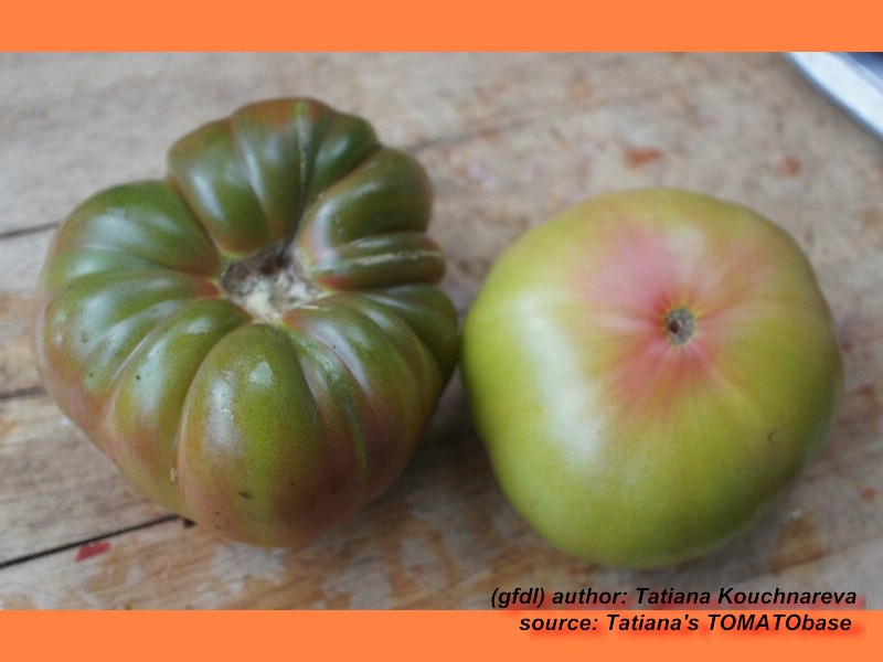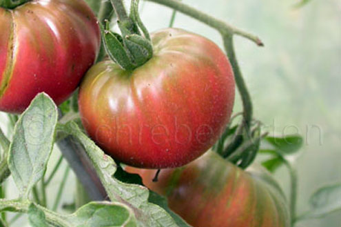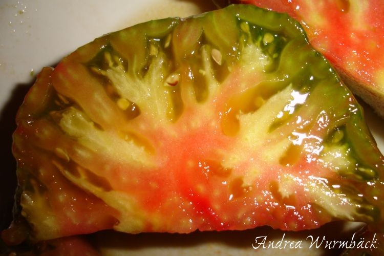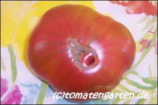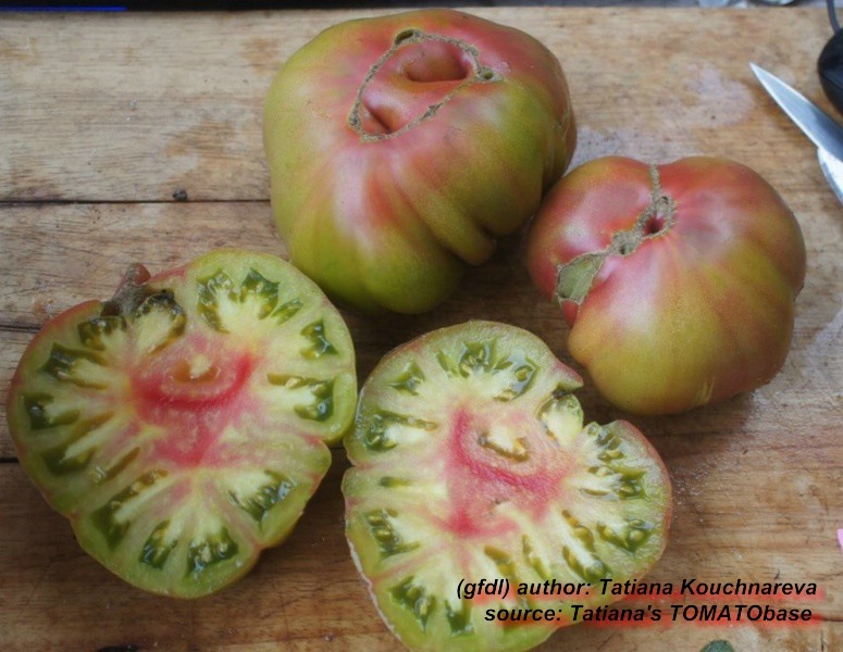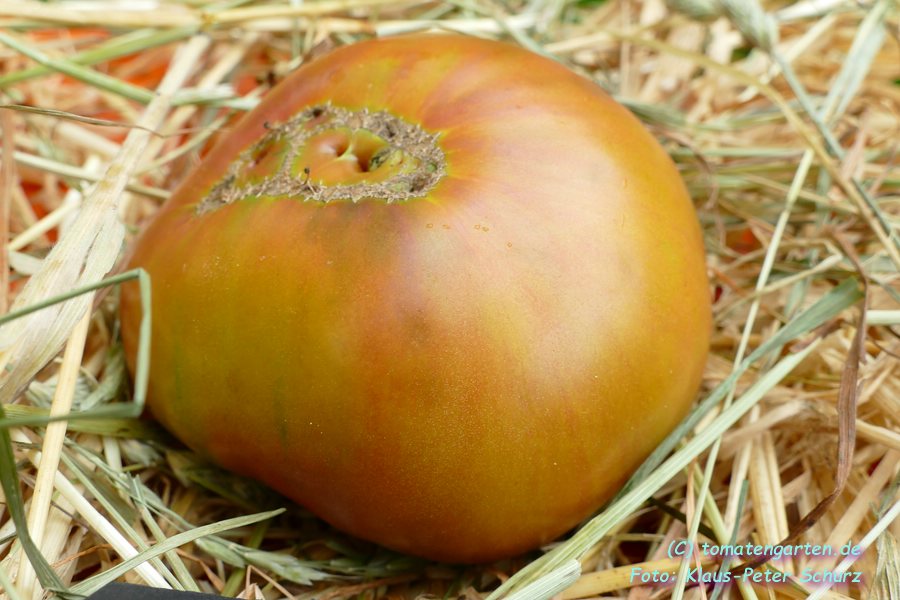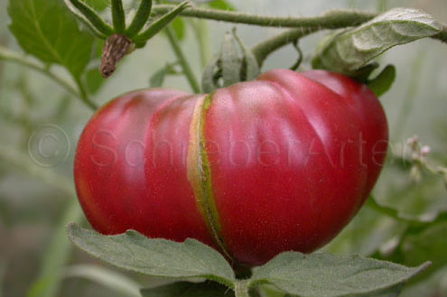 Sehr große, extrem breitrunde, im Kragenbereich etwas gerippte, grün-rote Früchte, die aufgeschnitten in den gleichen Farben marmoriert sind. Manche Früchte sind auch komplett rot durchgefärbt.