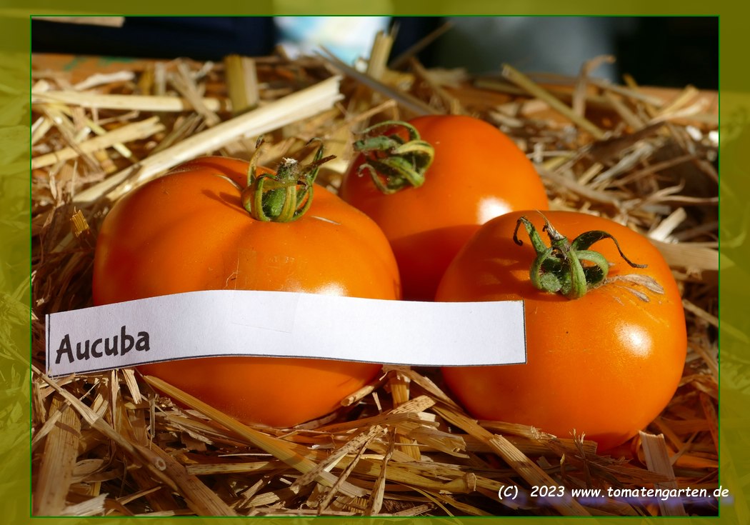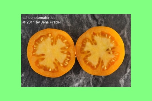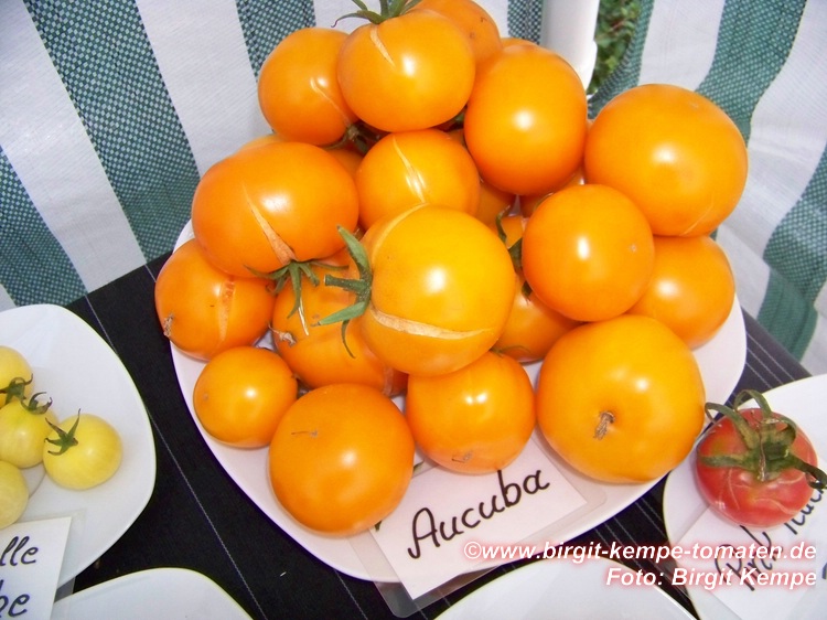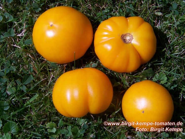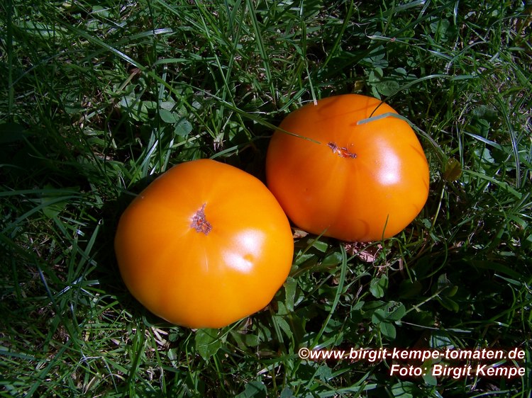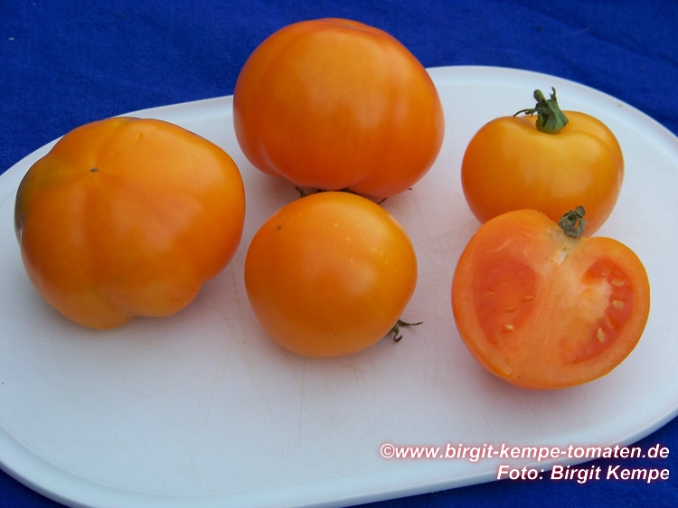 mittelgroße (ø meist 6 bis 7 cm), breitrunde, glatte, selten leicht gerippte, leuchtend orangefarbene Früchte