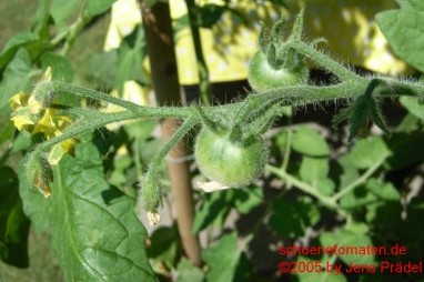 Angora Supersweet - sehr große Pflanze (über 3 m, auch mehrtriebig), schlanker Wuchs mittelfrüher Erntebeginn (Mitte August) geringer Ertrag (Braunfäulebefall) kleine (15 bis 20 g), runde, behaarte, rote Früchte süß-saftiger Geschmack (Quelle: www.schoenetomaten.de)