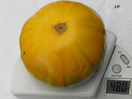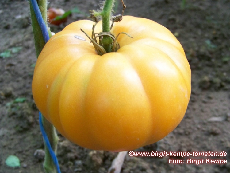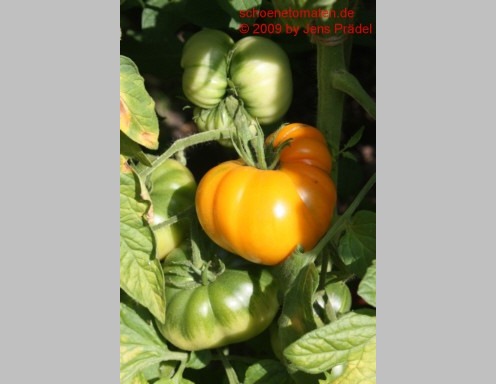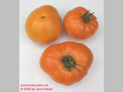 große (ø ca. 7 bis 8 cm), breitrunde, leicht gerippte, leuchtend orangefarbene Früchte
