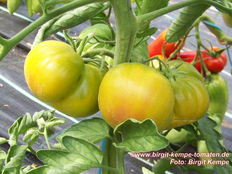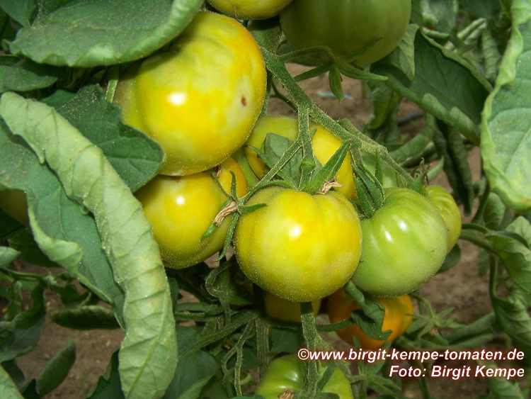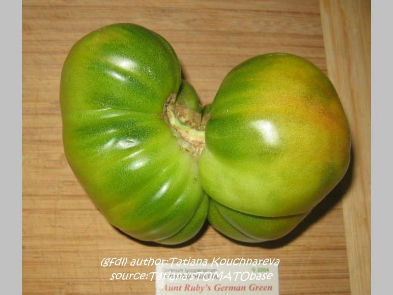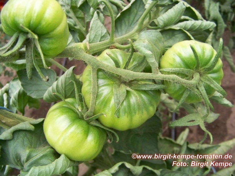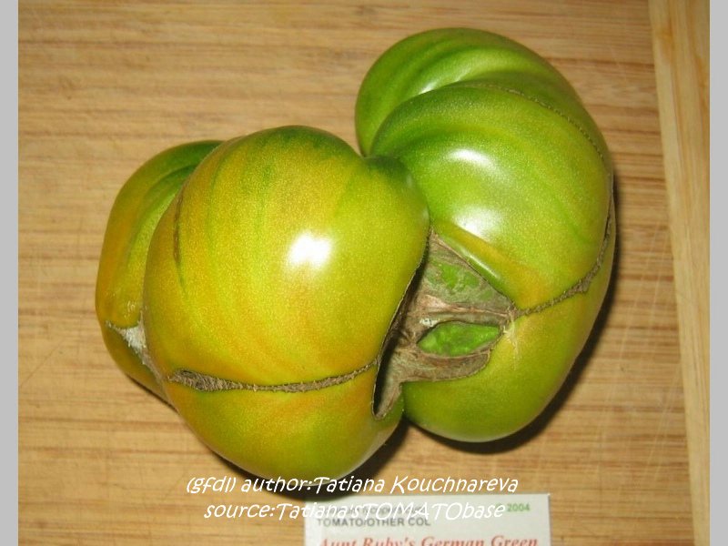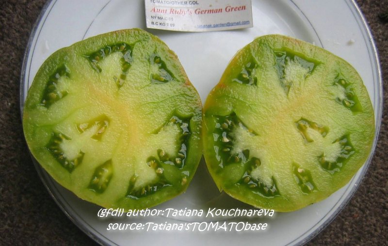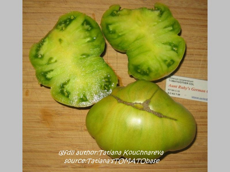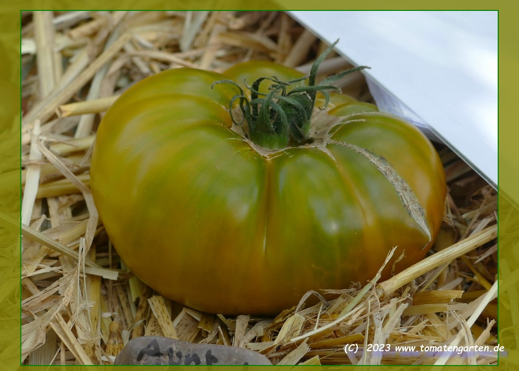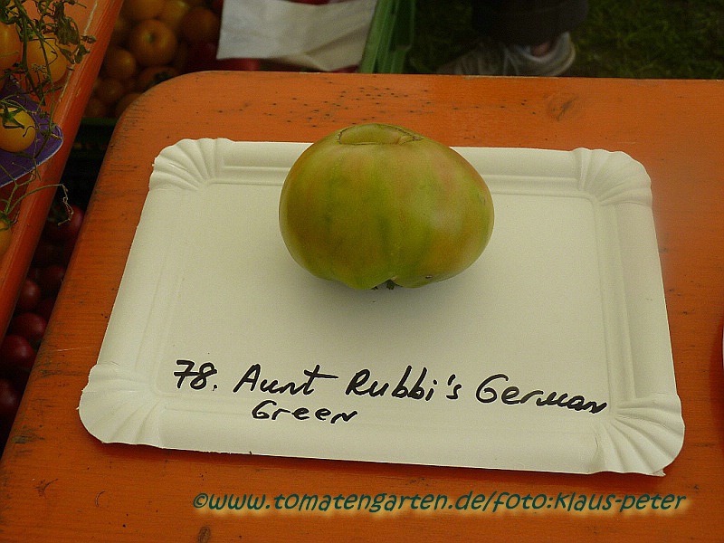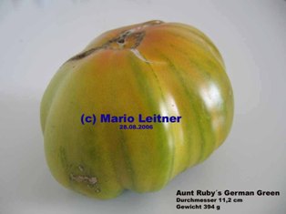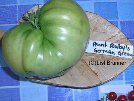 Aunt Ruby's German Green - mittelgroße Pflanze (bis 2 m), bei mir normalblättrig sehr später Erntebeginn (Anfang September) sehr geringer Ertrag große (bei mir etwa 150 g), runde, fleckig-gestreifte, grüne Früchte, die bei Vollreife sich von oben beginnend orange verfärben Bei einem optimalen Standort werden die Früchte sicherlich größer und fleischiger. würziger Geschmack (Quelle: www.schoenetomaten.de)