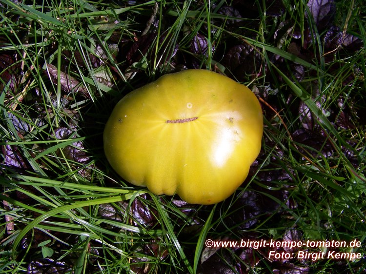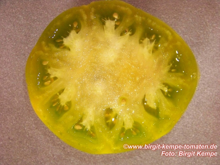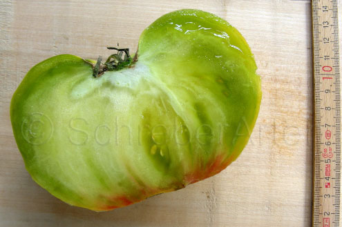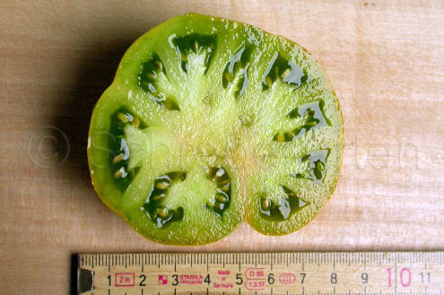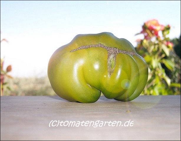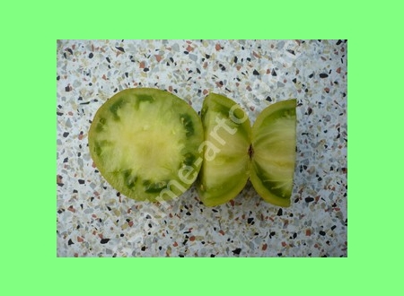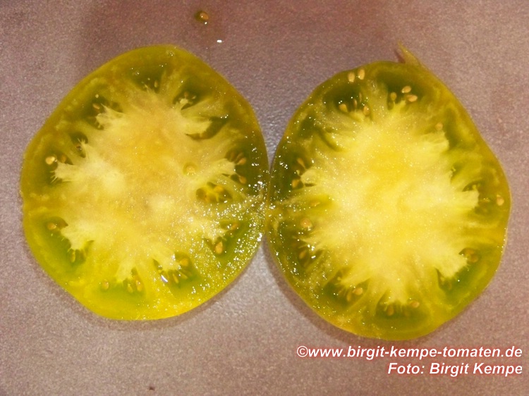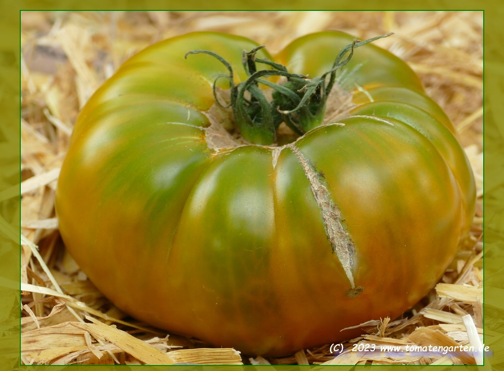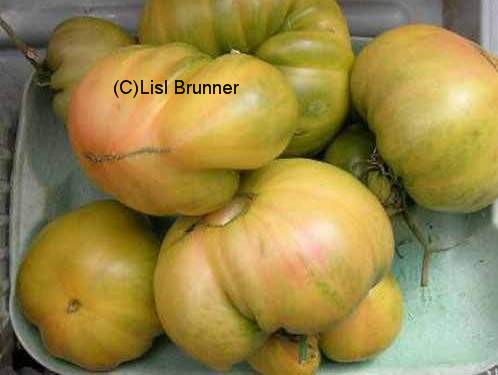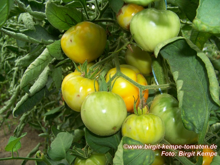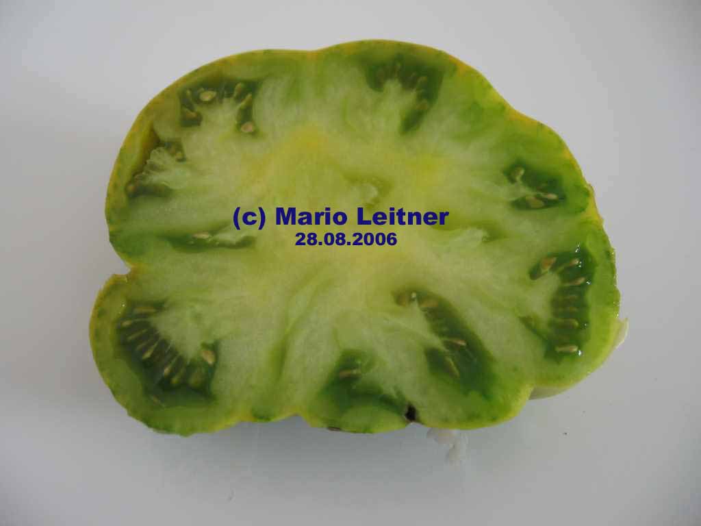Aunt Ruby's German Green - mittelgroße Pflanze (bis 2 m), bei mir normalblättrig sehr später Erntebeginn (Anfang September) sehr geringer Ertrag große (bei mir etwa 150 g), runde, fleckig-gestreifte, grüne Früchte, die bei Vollreife sich von oben beginnend orange verfärben Bei einem optimalen Standort werden die Früchte sicherlich größer und fleischiger. würziger Geschmack (Quelle: www.schoenetomaten.de)
