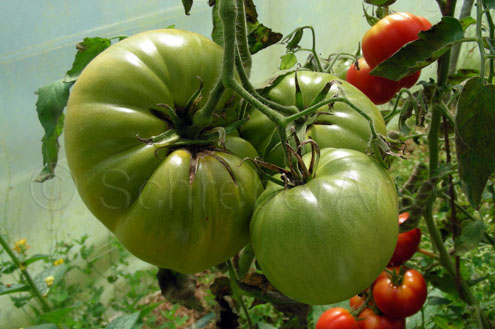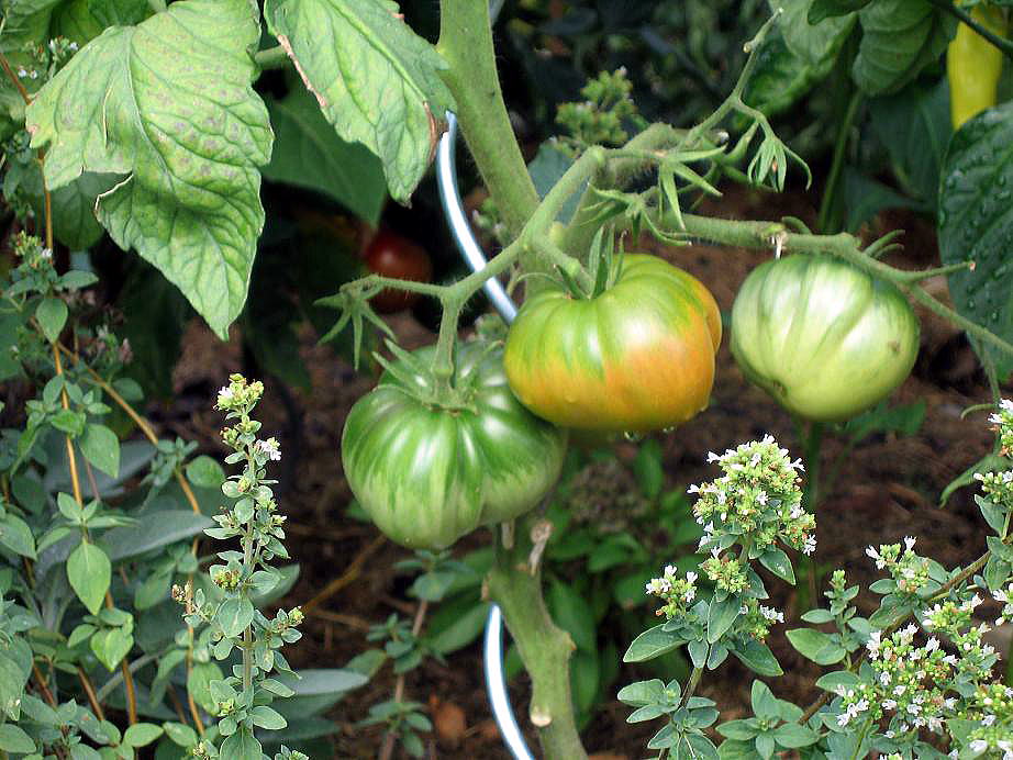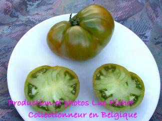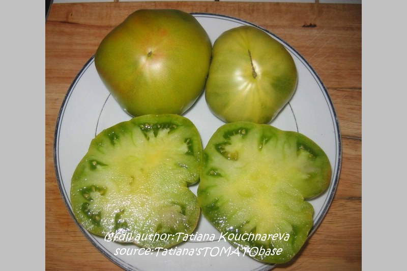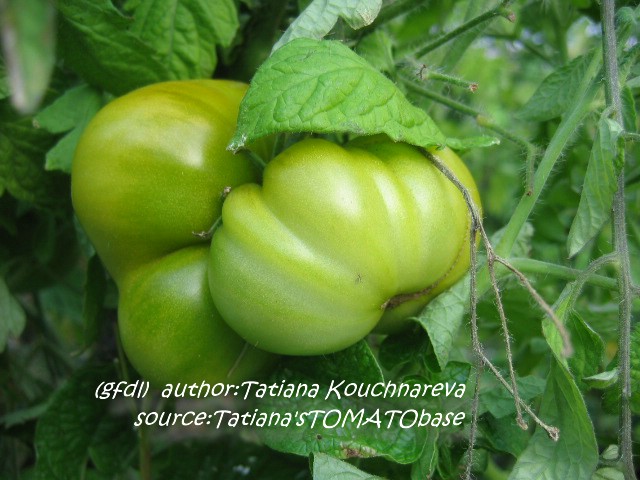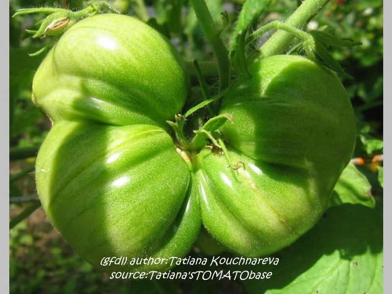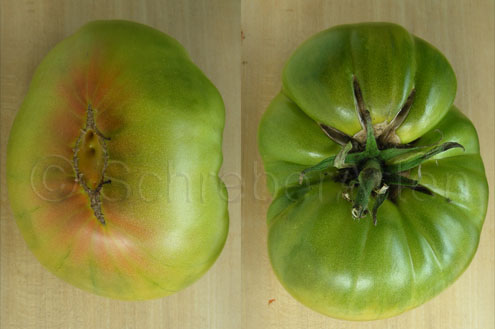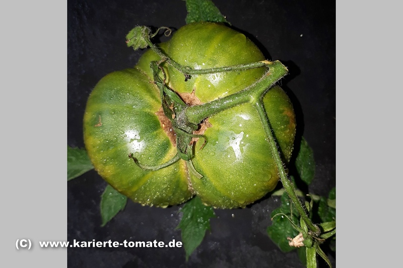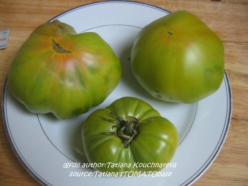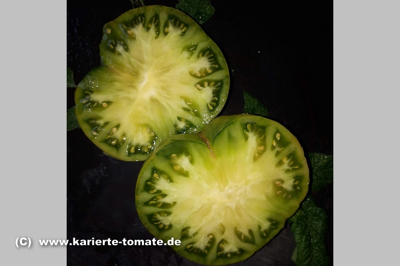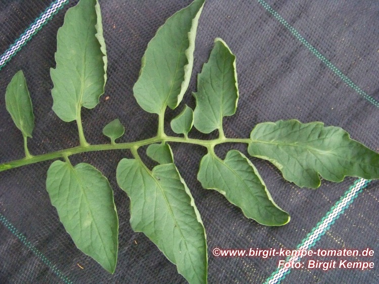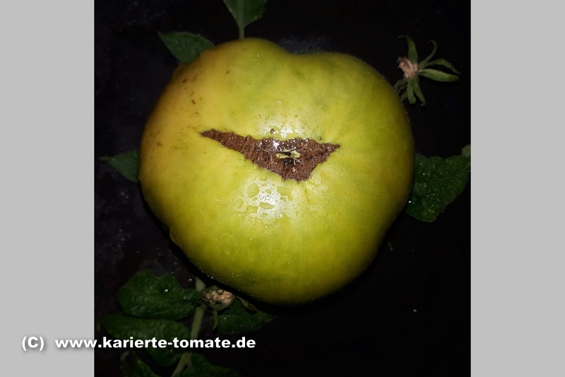 Aunt Ruby's German Green - mittelgroße Pflanze (bis 2 m), bei mir normalblättrig sehr später Erntebeginn (Anfang September) sehr geringer Ertrag große (bei mir etwa 150 g), runde, fleckig-gestreifte, grüne Früchte, die bei Vollreife sich von oben beginnend orange verfärben Bei einem optimalen Standort werden die Früchte sicherlich größer und fleischiger. würziger Geschmack (Quelle: www.schoenetomaten.de)