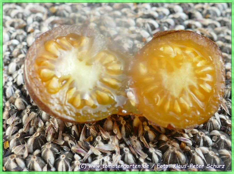 kleine (ø ca. 4 cm), 20 bis 40 g schwere, runde, dunkelgelbe bis orangefarbene Früchte mit violett-schwarz eingefärbtem Kragen