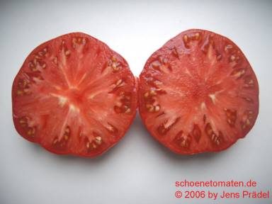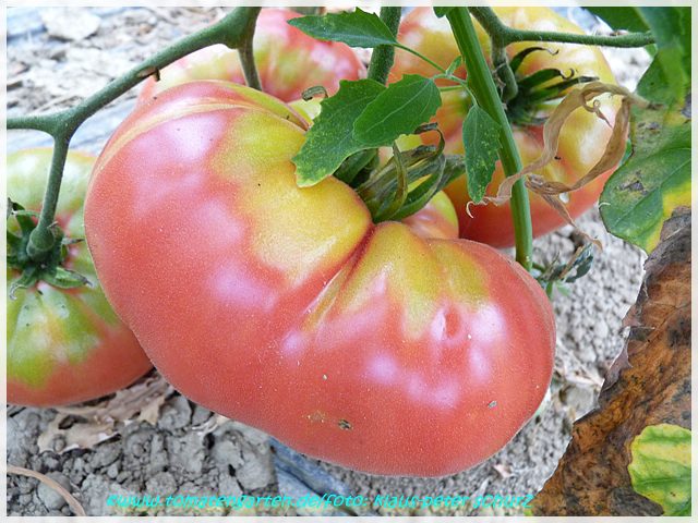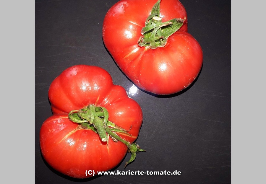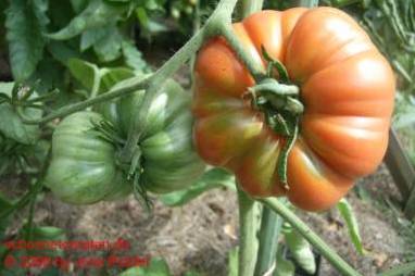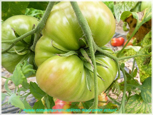 Aunt Ginny's Purple - früher Erntebeginn (Anfang August) mäßiger Ertrag sehr große, plattrunde, leicht gerippte, teilweise auch unförmige, dunkelrote bis bräunlich-rote Früchte größte geerntete Frucht: 366 g (500 Gramm scheinen möglich zu sein.) aromatischer Geschmack, saftig und sehr fleischig (Quelle: www.schoenetomaten.de)