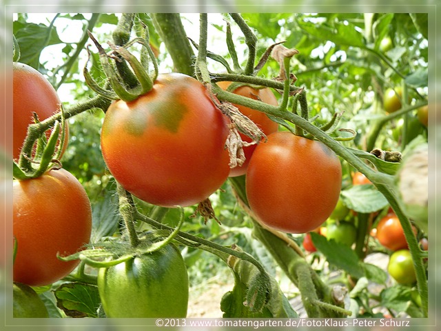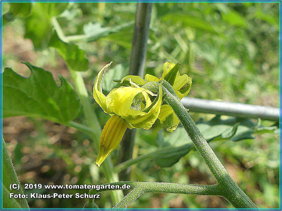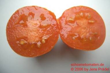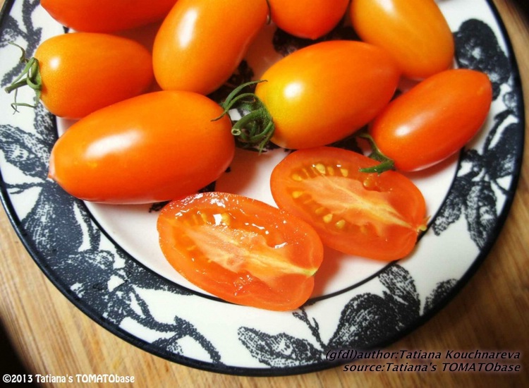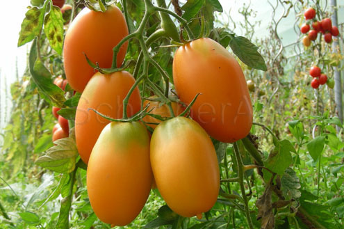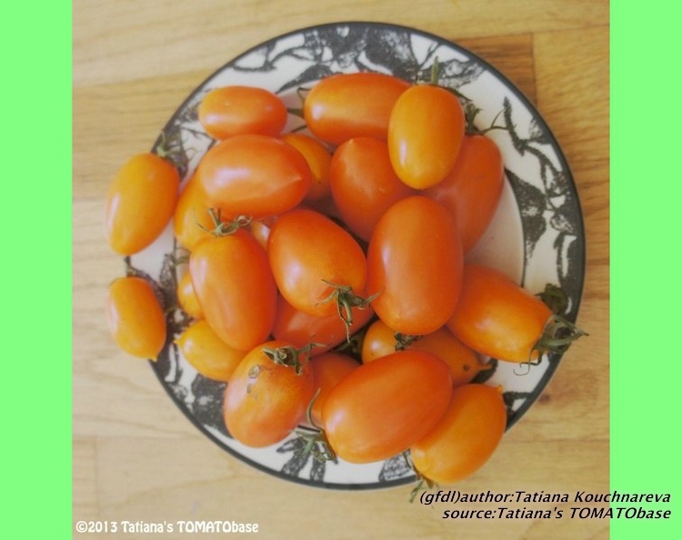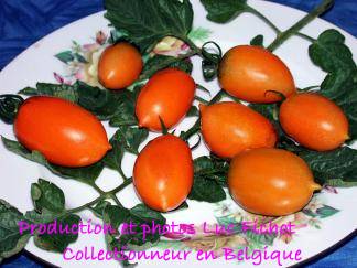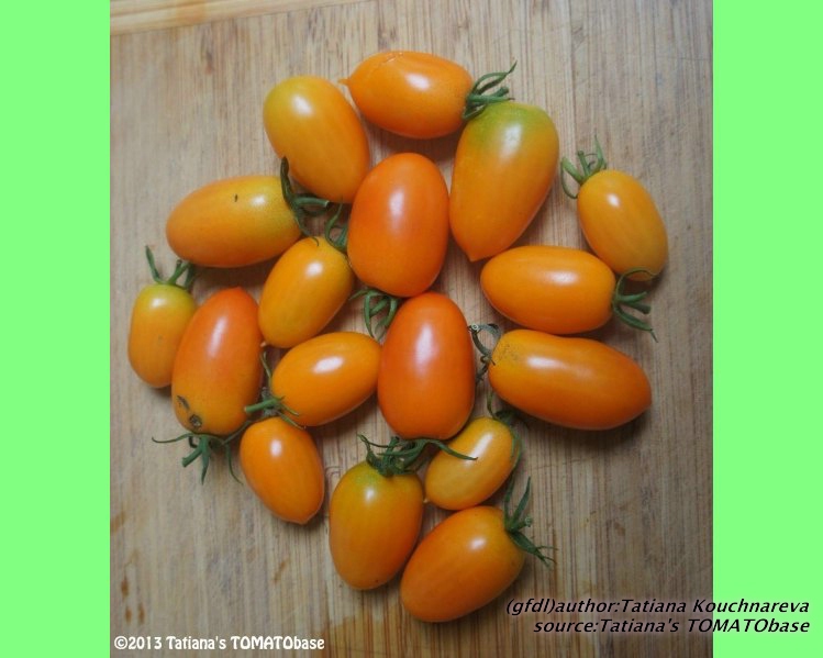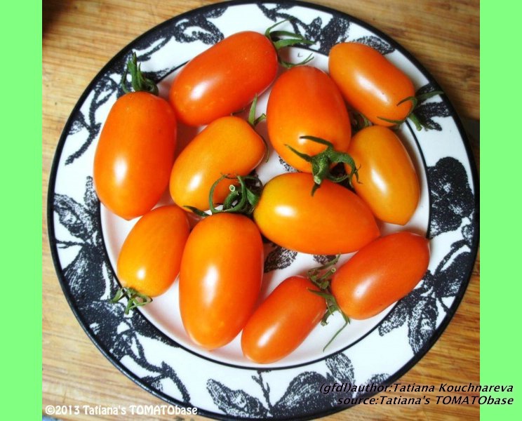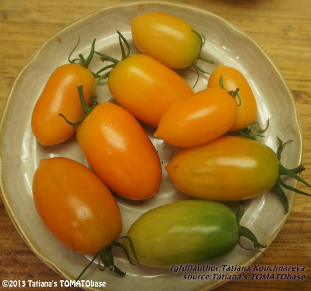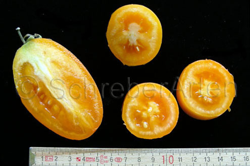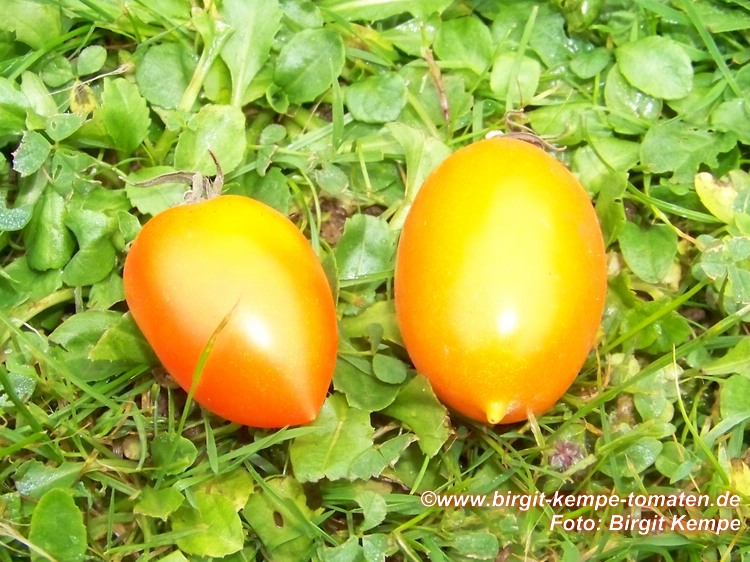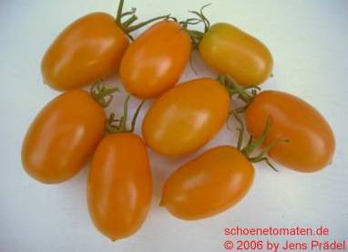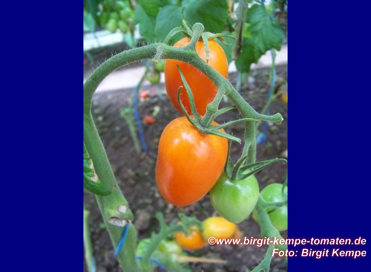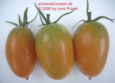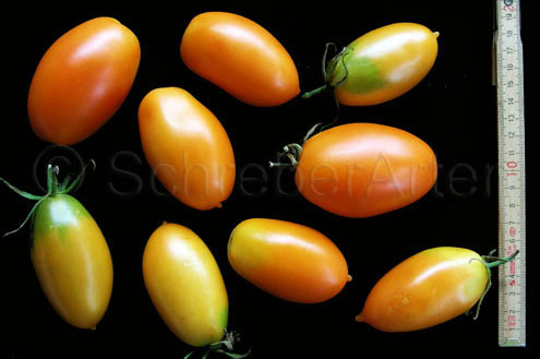 Amish Gold - große Pflanze (über 2 m) mittelfrüher Erntebeginn (Mitte August) guter Ertrag mittelgroße, 40 bis 60 g schwere, zapfenförmige, orangefarbene Früchte mit ganz kleiner Spitze Der zunächst grüne Bereich um den Stielansatz verschwindet bei Vollreife. schöner, aromatischer Geschmack (Quelle: www.schoenetomaten.de)