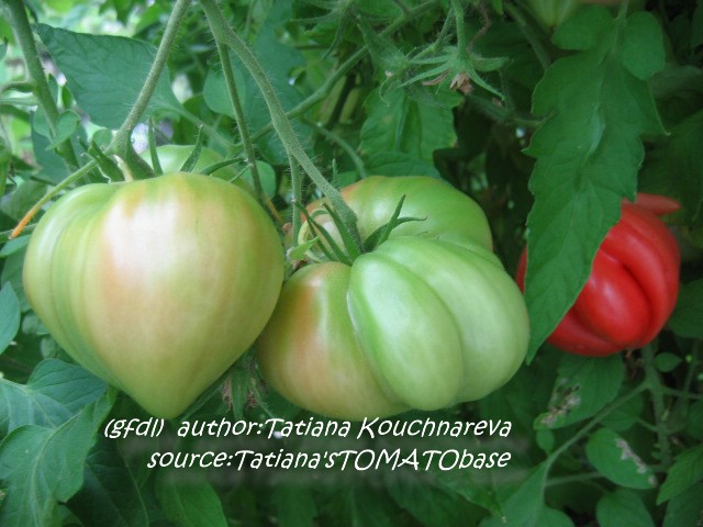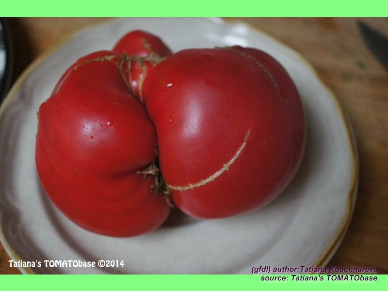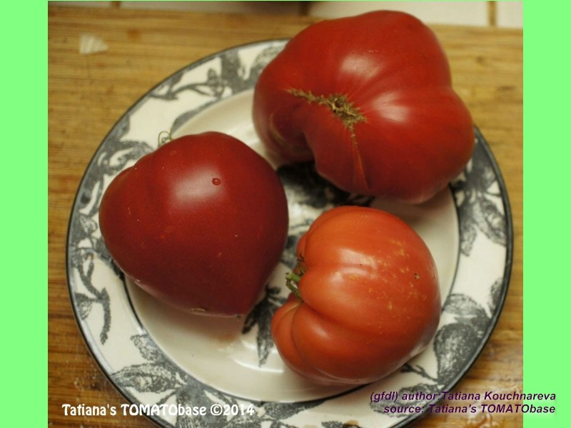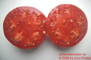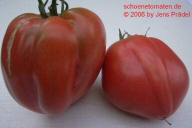 große bis sehr große , überwiegend herzförmige und zum Teil gerippte, aber auch unförmig breitrunde, dunkelrote Früchte, nicht platzfest