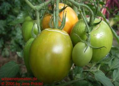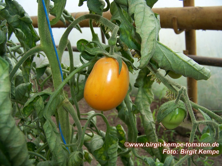 Aviro - mittelgroße Pflanze (1,5 bis 2 m) mittelfrüher Erntebeginn (Mitte August) guter Ertrag sehr feste, mittelgroße (70 bis 140 g), ovale (pflaumenförmig), orangefarbene Früchte sehr süß und saftig (Quelle: www.schoenetomaten.de)