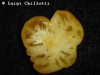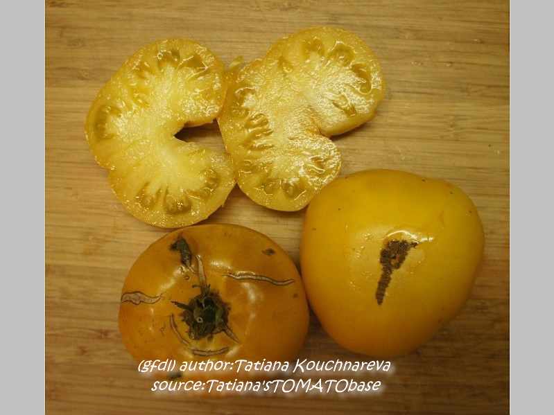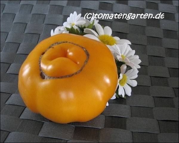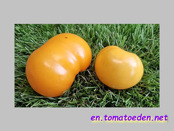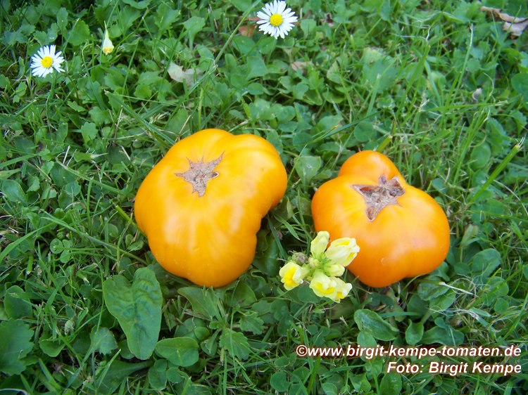 sehr große (ø 10 bis 11 cm, 6 bis 7 cm hoch), breitrunde, dunkelgelbe bis orangefarbene Früchte