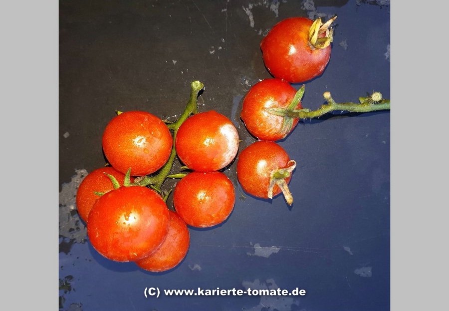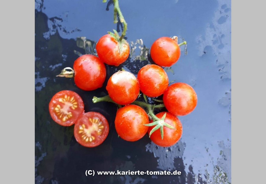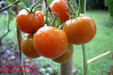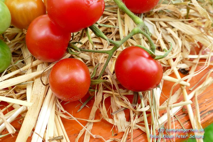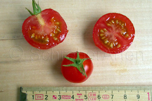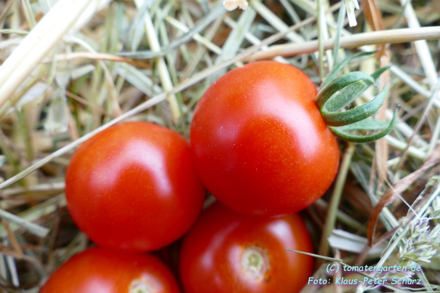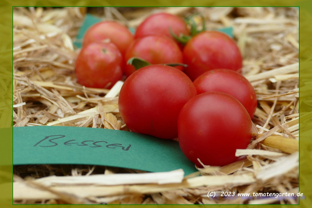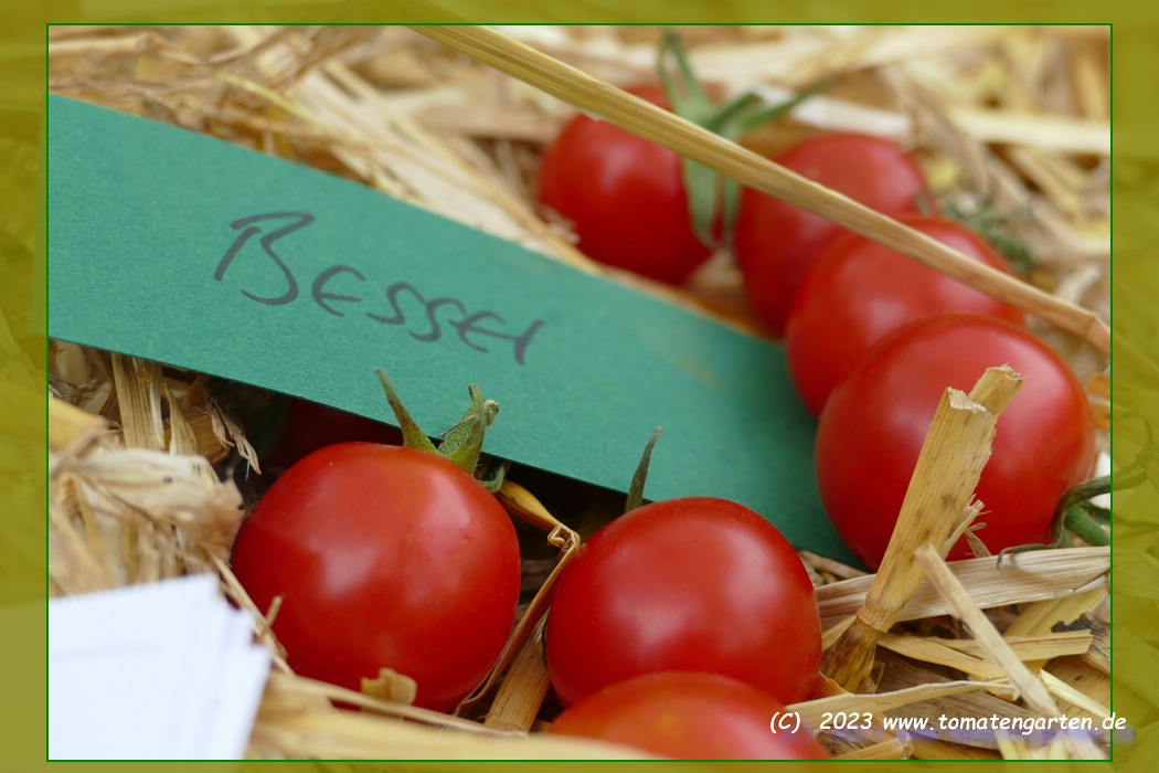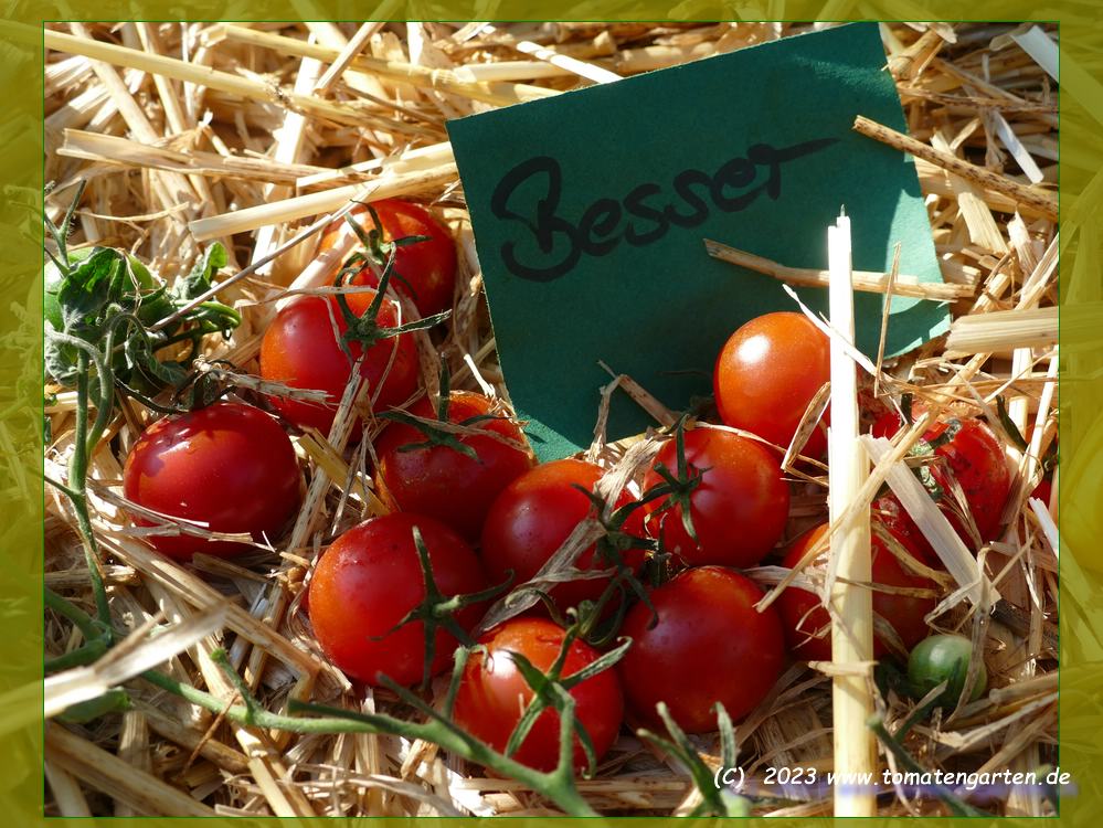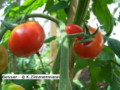 Besser - rote runde mittelgrosse (ca. 3-4 cm) saftige Früchte mit süsslichem Geschmack; Reife ab Ende Juli; sehr alte Kirschtomate aus dem 18.Jahrhundert; hoher langanhaltender Ertrag. (Quelle: www.d-landsmann.de / Mit freundlicher Genehmigung des Autors)