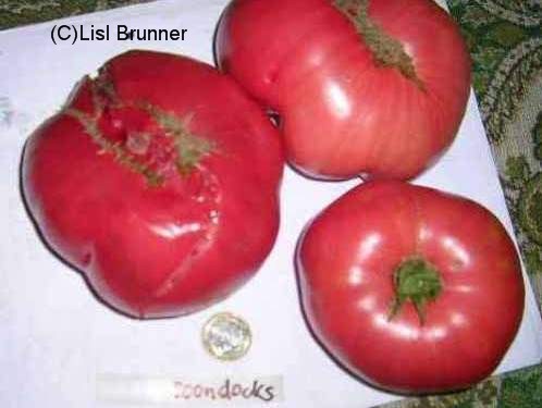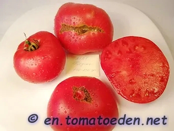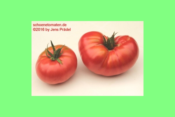 sehr große (ø 8 bis 12 cm, 4,5 bis 5,5 hoch), breitrunde, kaum gerippte, pinkrote Früchte