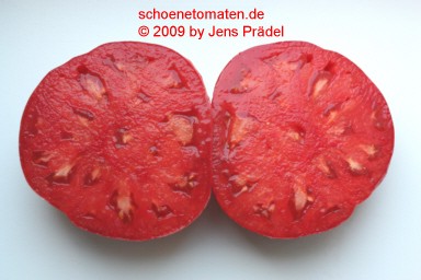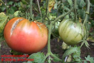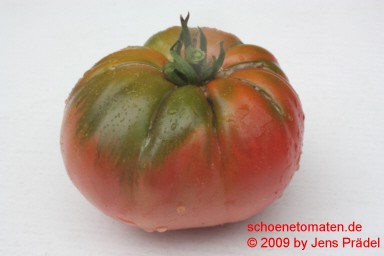 sehr große, breitrunde, wenig gerippte, rosarote Früchte, bei Temperatur- und Feuchtigkeitsschwankungen Risse im Kragenbereich