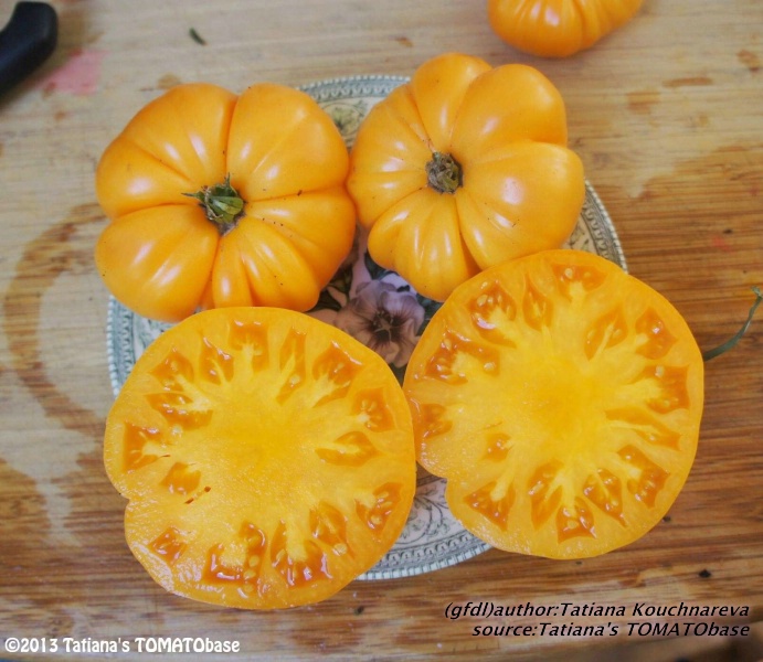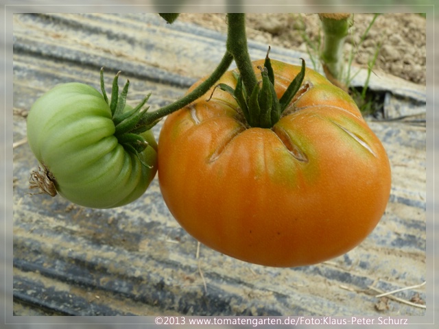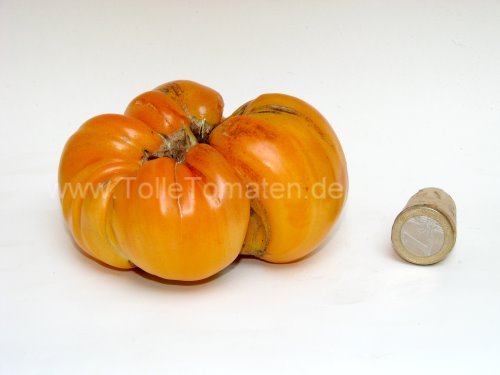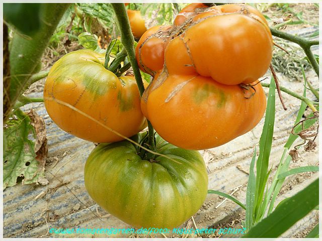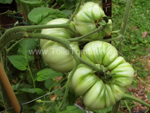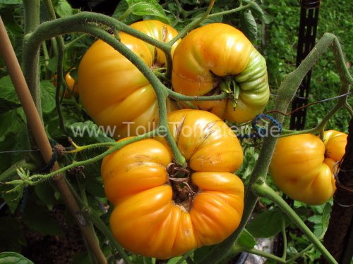 Aromatisch mit wenig Säure. Bei uns im Voralpenland auch im Treibhaus durch die enorme Fruchtgröße nur mäßig ertragreich. Perfekt für Tomatenkonfitüre mit getrockneten, über Nacht eingeweichten Aprikosen. Ausprobieren!