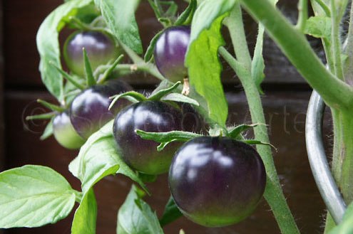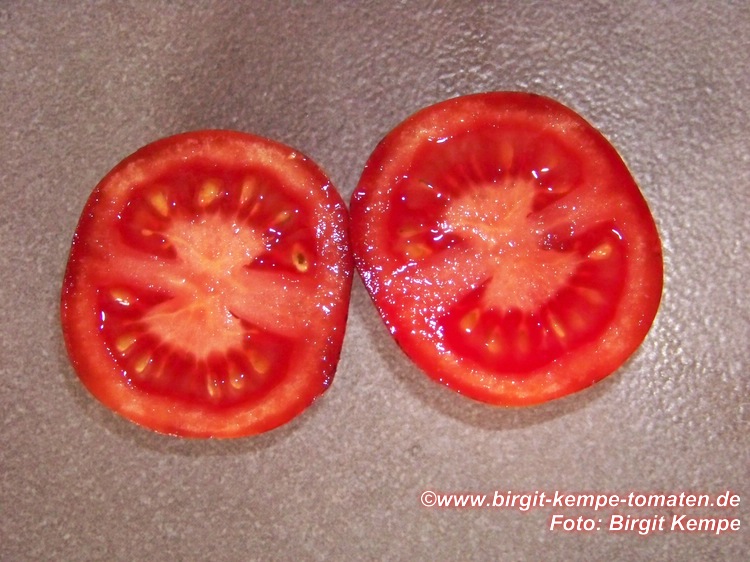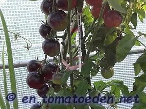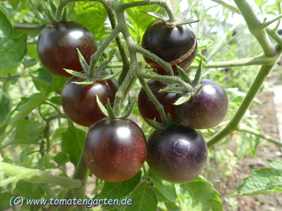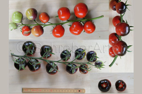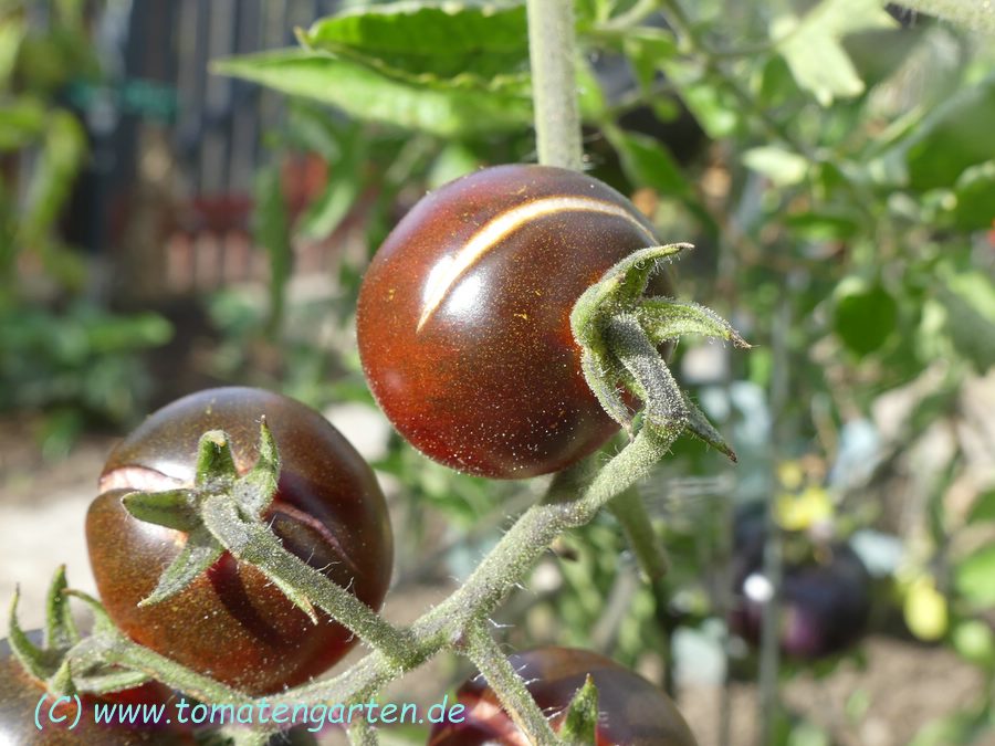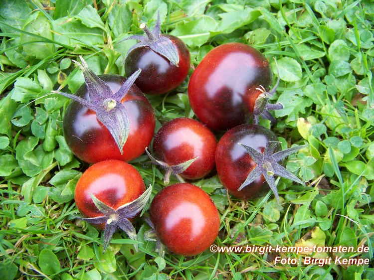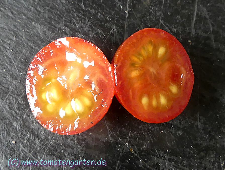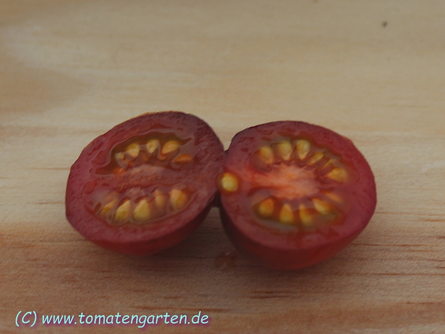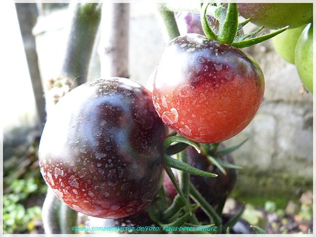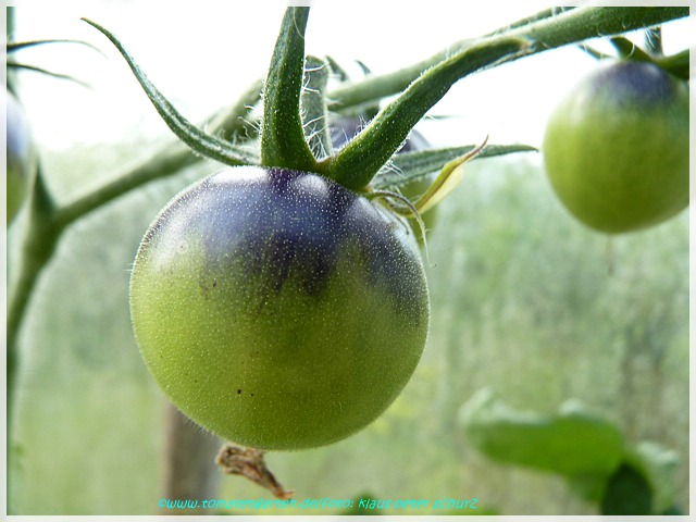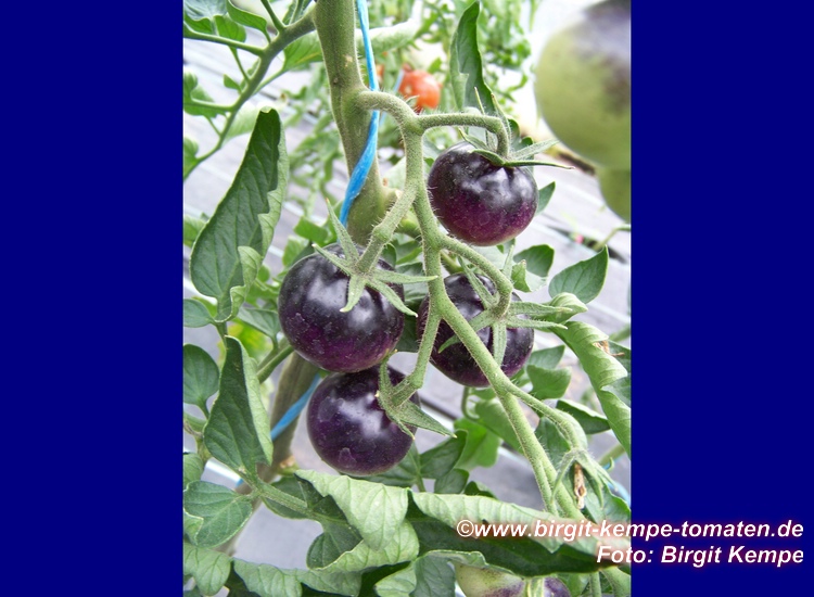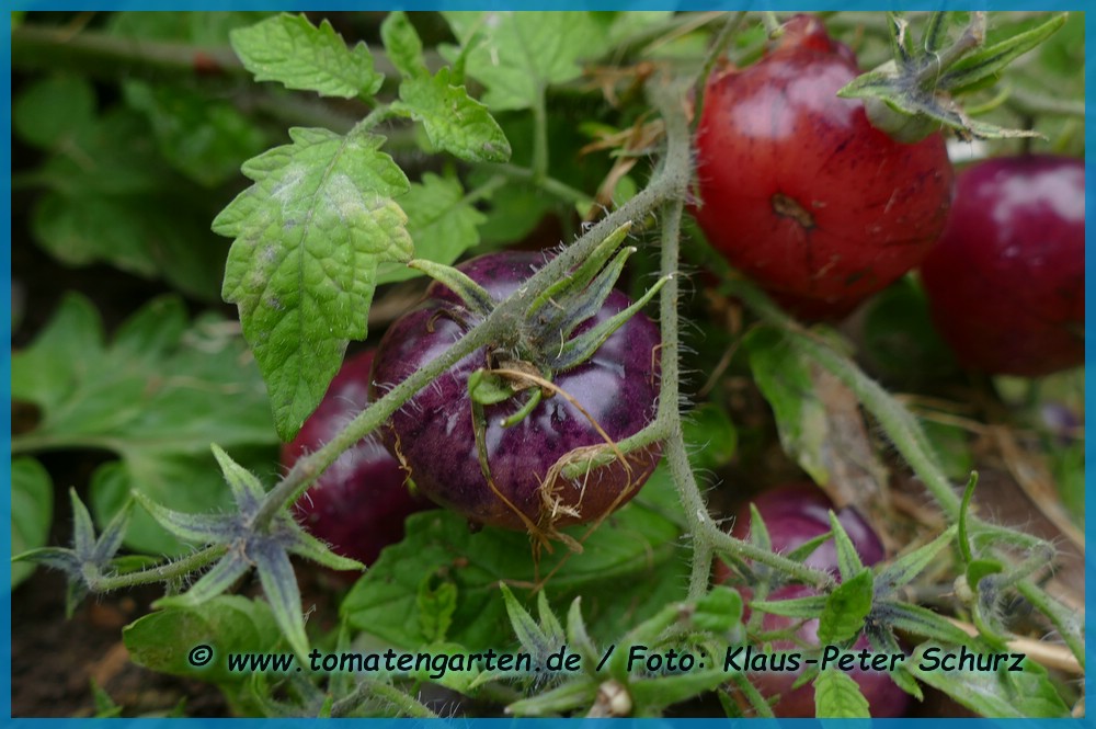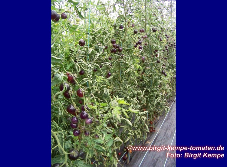 Angebaut 2021 und 2022 im Freiland mit Überdachung. Wunderschöne, glänzende Früchte, die sich Anfang Juli ausbilden, aber sehr lange zum Ausreifen benötigen. Erste Ernte Ende August. Geschmacklich ziemlich fade, aber im Salat ein Hingucker. Pflanze ca. 1,50m hoch. Saatgutarm.