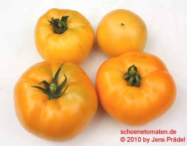 große bis sehr große (ø bis 10 cm), breitrunde, kaum gerippte, orangefarbene, feste Früchte
