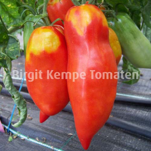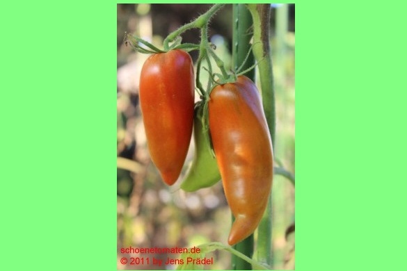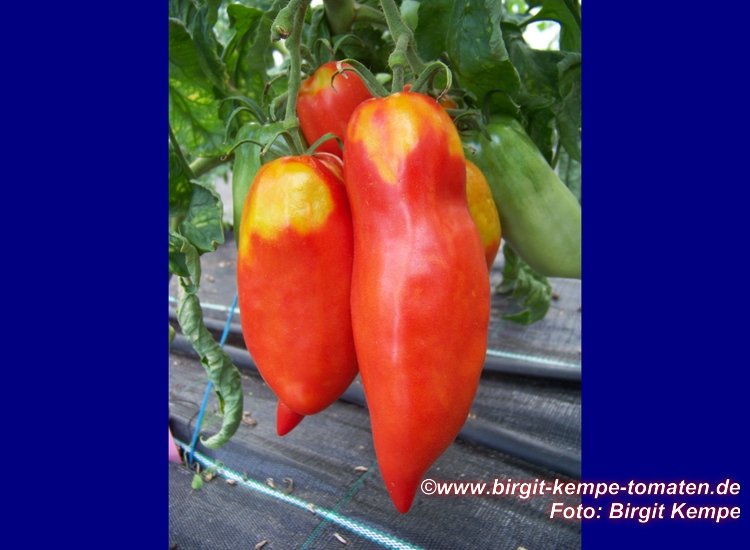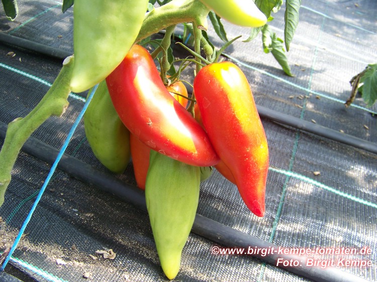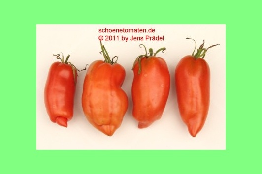 mittelgroße, 80 bis 110 g schwere, paprikaförmige (10 cm lang und 5 cm breit), rote Früchte mit hakenförmiger Spitze