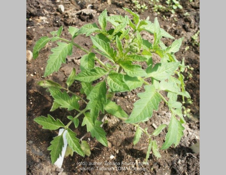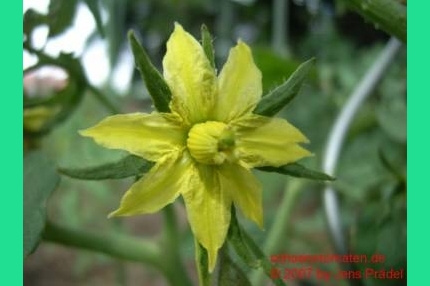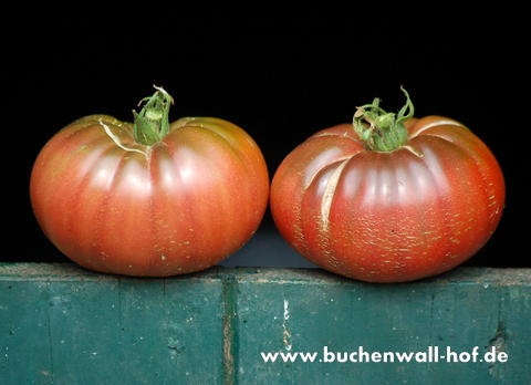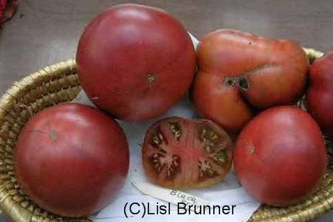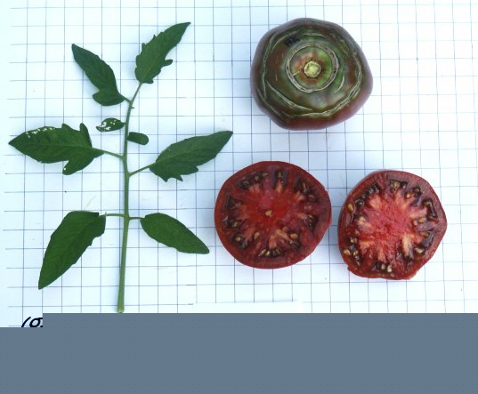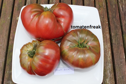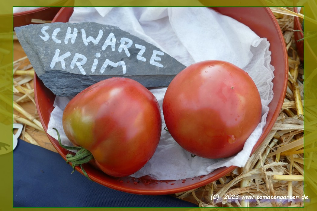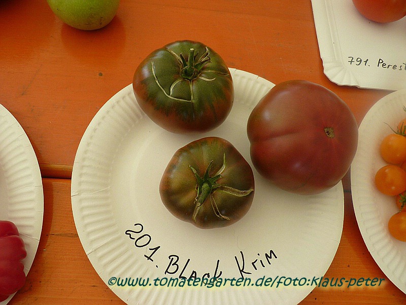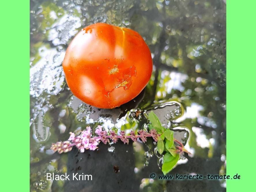 Black Krim - mittelgroße, kartoffelblättrige Pflanze (bis 2 m) mittelfrüher Erntebeginn (Mitte August) guter Ertrag mittelgroße bis große, breitrunde, scharlachrote Früchte mit schwarzgrünem Kragen größte geerntete Frucht: 301 g ausgezeichneter, süßer Geschmack, sehr saftig leider nicht gut lagerbar Sehr schöne Sorte! (Quelle: www.schoenetomaten.de)