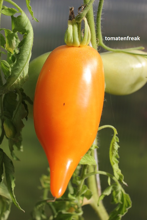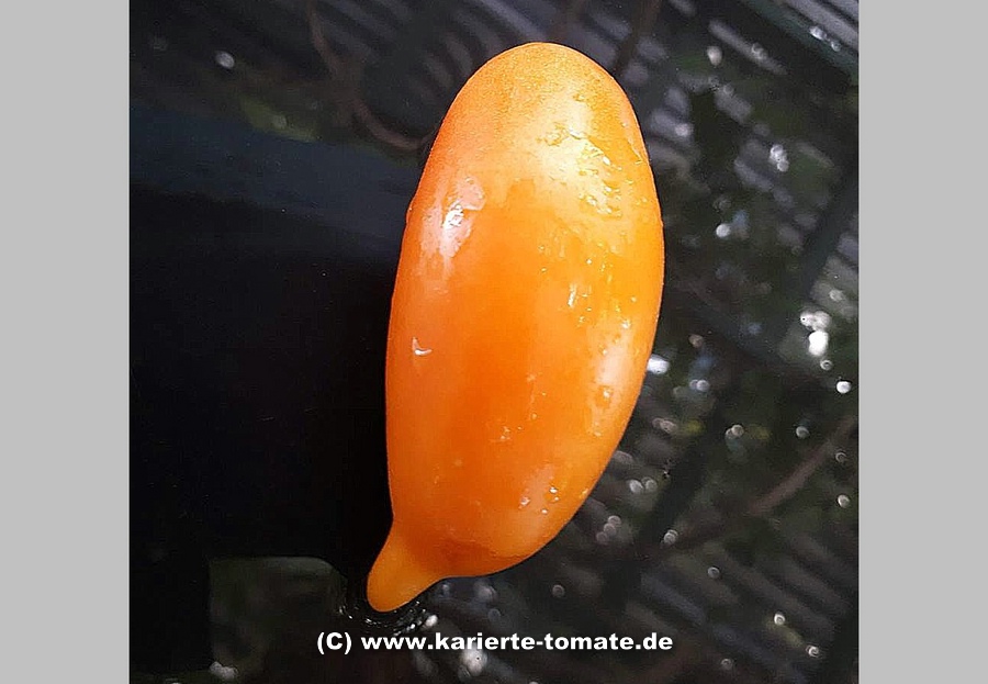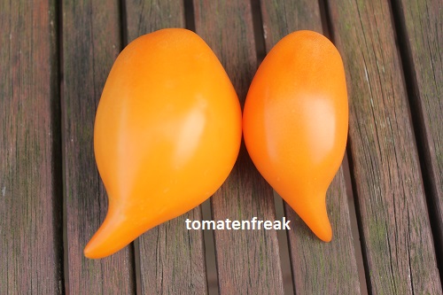 mittelgroße (ca. 4,5 bis 5,5 cm breit und 8 bis ca. 10 cm lang), 60 bis 130 g schwere, zapfenförmige, orangefarbene Früchte mit langer, hakenförmiger Spitze
