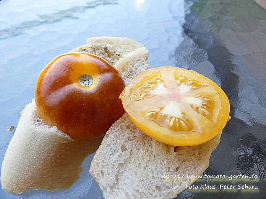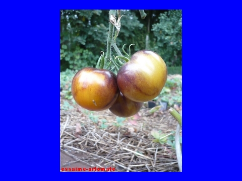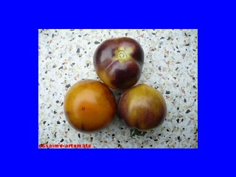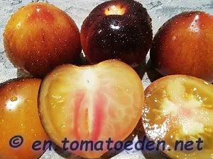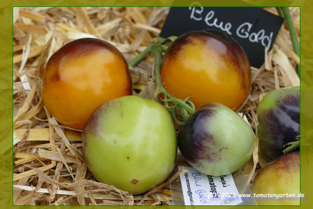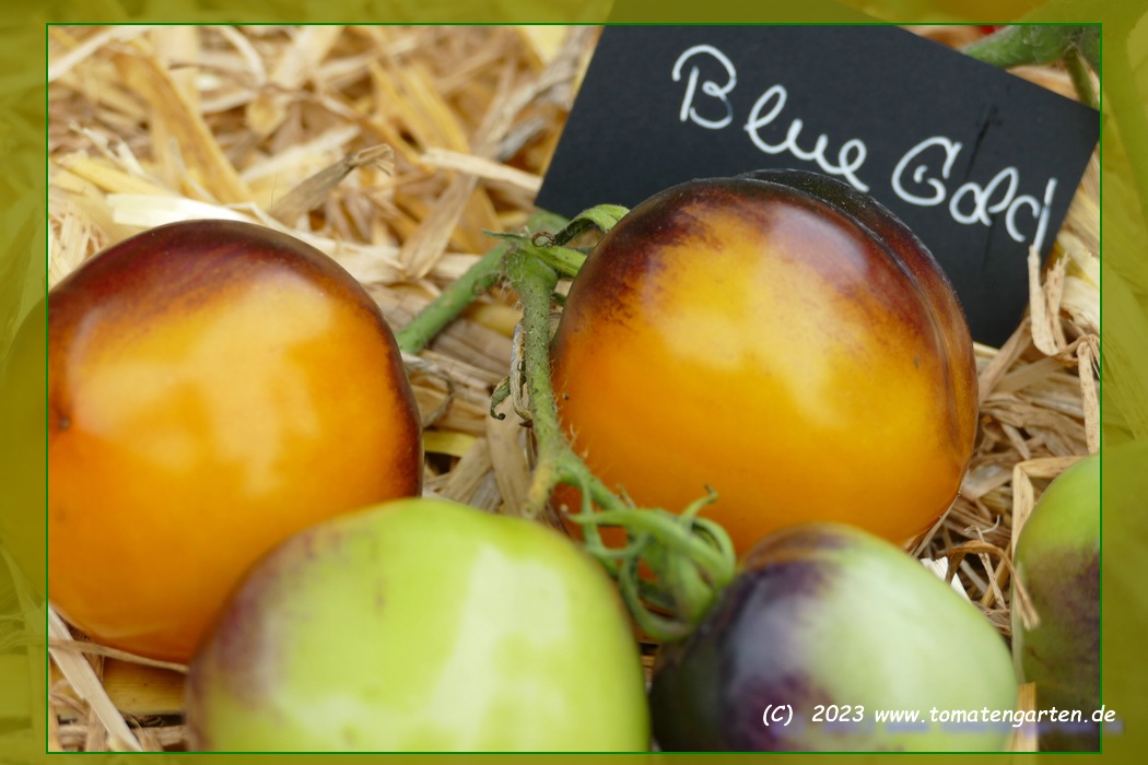 Tomate mit sehr interessanter Farbgebung und schmeckt auch noch gut. Der blauschwarze obere Teil bildet einen starken Kontrast zum gelben Unterteil womit sie in jedem Tomatenkorb auffällt.Der gelbe Pedant zur blauroten Blueberry.