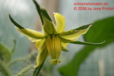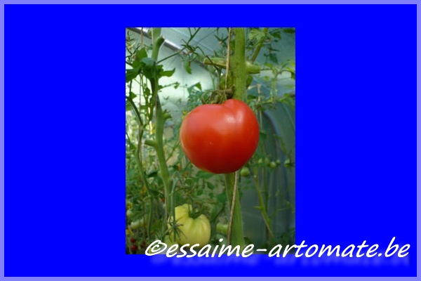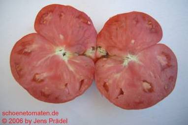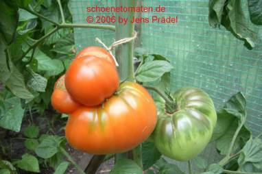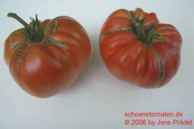 Bilders - mittelgroße (bis 2 m), kartoffelblättrige Pflanze, lockerer Wuchs früher Erntebeginn (Anfang August) ertragreich sehr große, breitrunde, leicht gerippte und meist etwas unförmige, rote Früchte größte geerntete Frucht: 520 g sehr fleischig (kaum Fruchtkammern zu sehen) und leckerer Geschmack (Quelle: www.schoenetomaten.de)