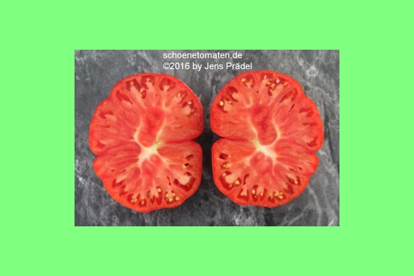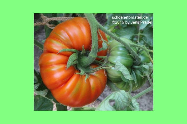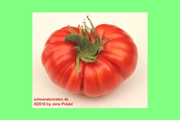 sehr große (ø 8,5 bis 10 cm), breitrunde (5 cm hoch), im Kragenbereich gerippte, kräftig rote Früchte