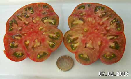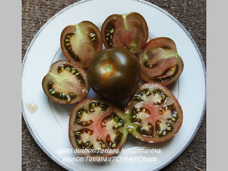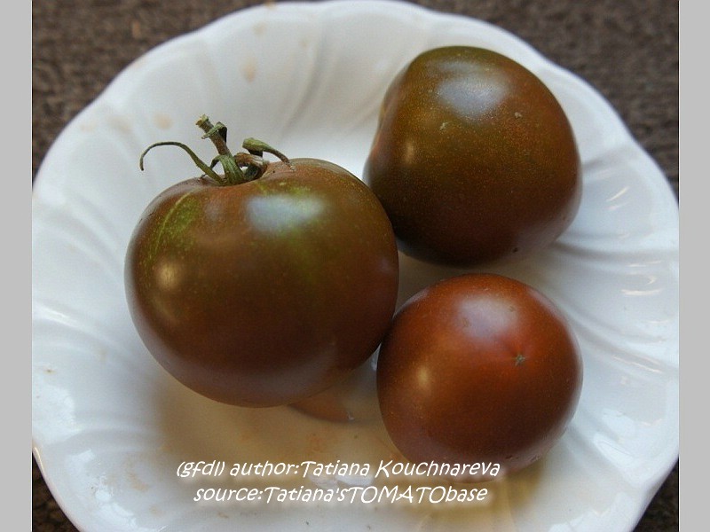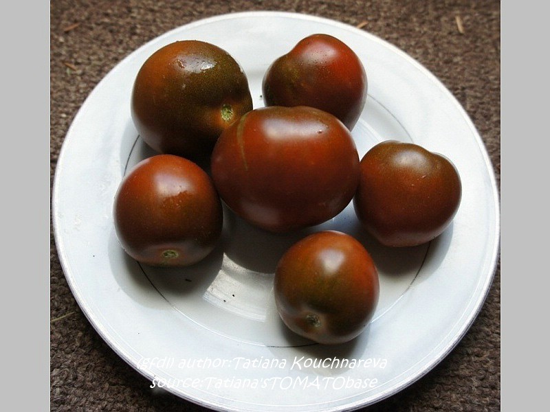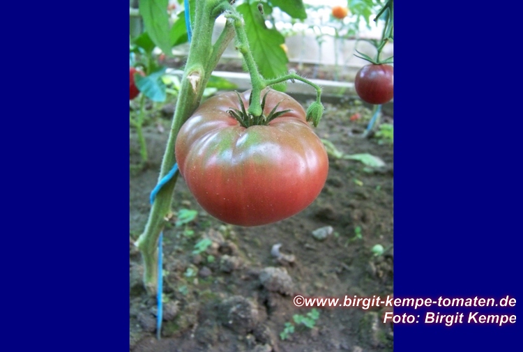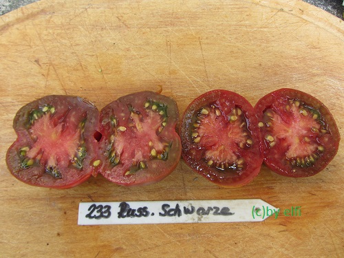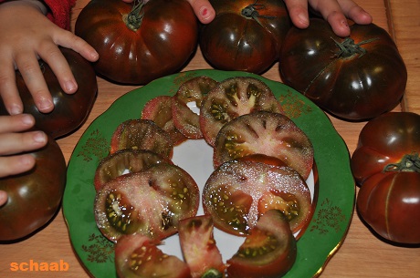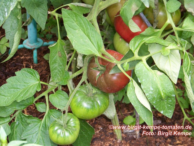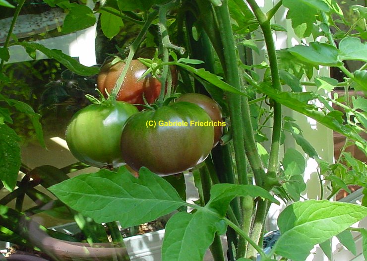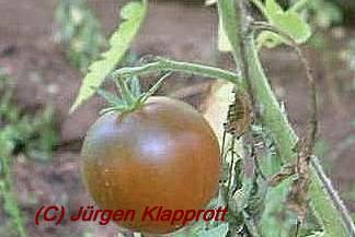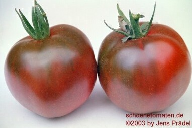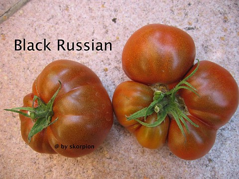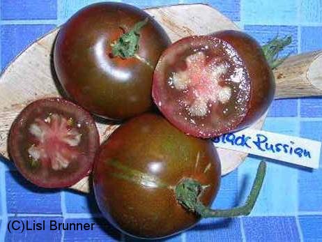 Black Russian - sehr große Pflanze (2 bis 3 m) später Erntebeginn (Mitte August) mäßig tragend große, runde, schwarzrote Früchte sehr saftig, würzig (Quelle: www.schoenetomaten.de)