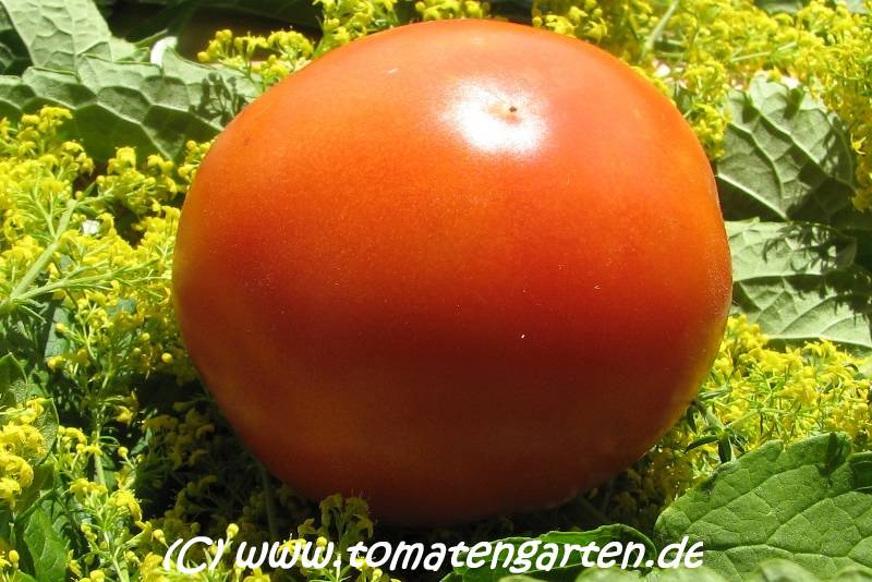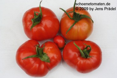 mittelgroße (auf die Pflanzengröße bezogen große ), breitrunde, glatte, glänzende, rote Früchte