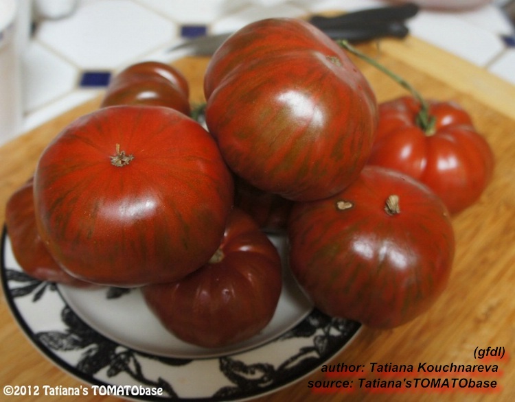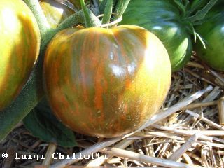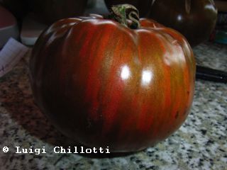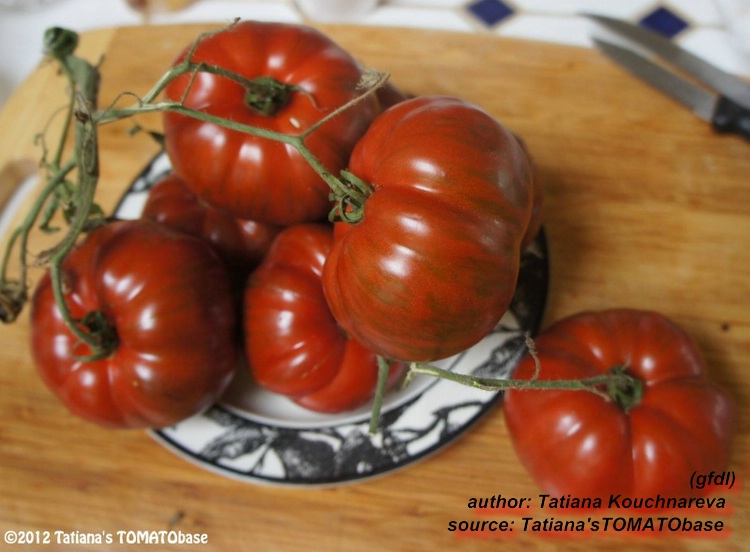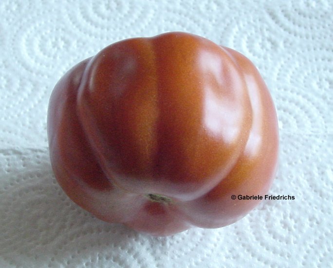 Brown Flesh - große Pflanze (bis 2 m) mittelfrüher Erntebeginn (Mitte August) mittlerer Ertrag große bis teilweise sehr große, überwiegend hochrunde und stumpf gerippte, braunrote Früchte mit Hohlräumen größte geerntete Frucht: 319 g sehr kräftiger Tomatengeschmack, zum Füllen geeignet nicht sehr fleischig (wie der Name eigentlich verspricht) (Quelle: www.schoenetomaten.de)