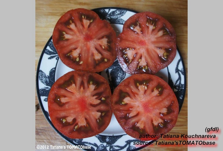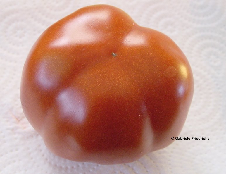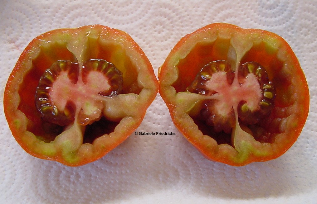 die bisher eingestellten bilder der sorte zeigen die sorte brown flesh als vollfleischige tomate. das hat mich ein wenig nachdenklich gemacht, denn meine tomaten der sorte waren eher hohl ähnlich einer paprikatomate. das nachlesen im sortenbuch von gerhard bohl bestätigte meine meinung, dass es hier zwei eher divergierende sortenbilder gibt. nun habe ich mir eigentlich vorgenommen, eine sorte unter dem namen brown flesh hollow einzustellen. vielleicht kommt das so am besten rüber. (tomatengarten als admin)