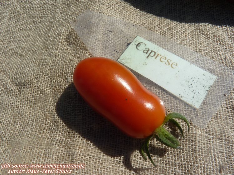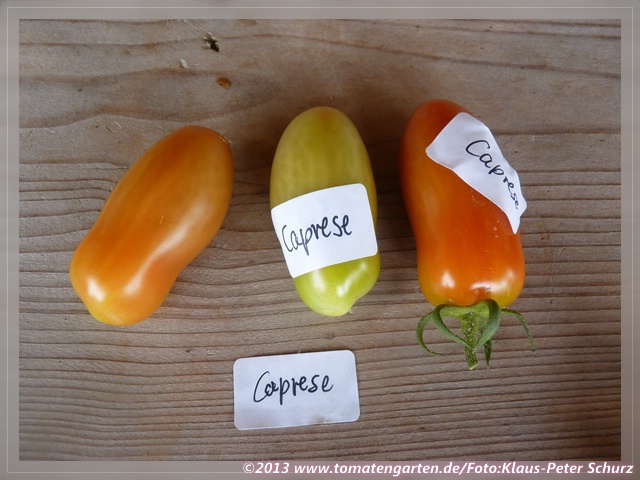 sehr leckere und aromatische Sorte, Geschmack eher süßlich. Eignet sich wunderbar für alles - Tomatensalat, trocknen, einlegen, Tomatensoße... Die Sorte steht bei mir halbschattig ohne jede Überdachung im Garten. Die Braunfäule kommt erst sehr spät zum Ende der Erntezeit. Die Caprese trägt üppig und wird bei mir - wenn ich sie lasse, wirklich 2m hoch. Ich habe die Tomaten praktisch aus dem Aprikosenbaum geerntet :-)