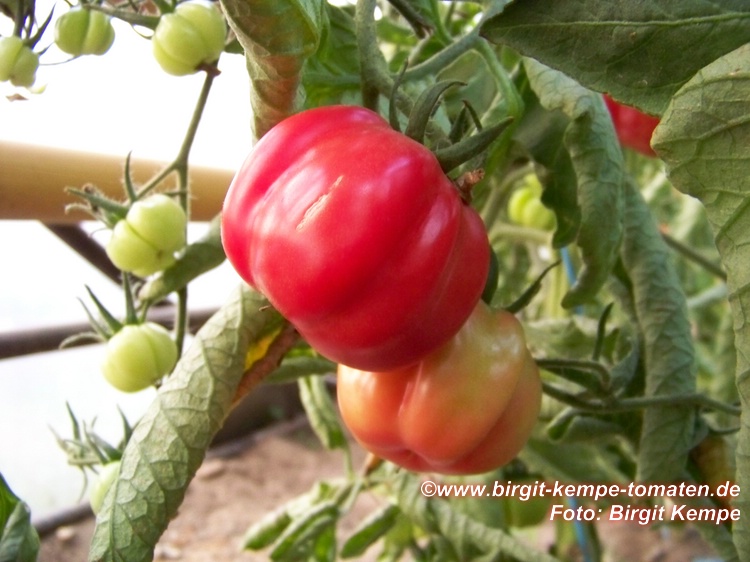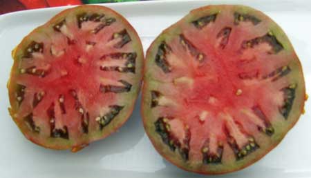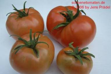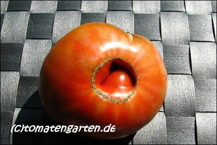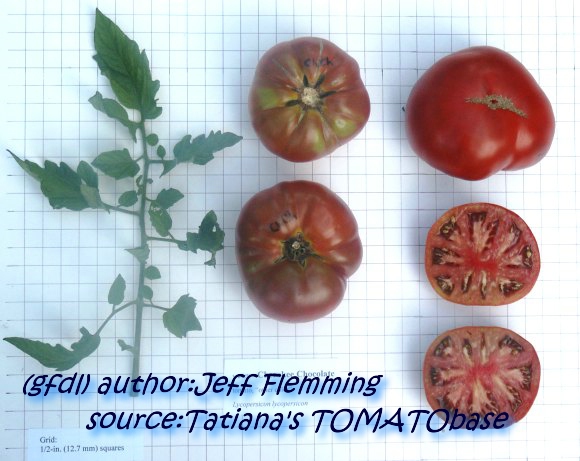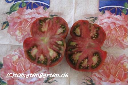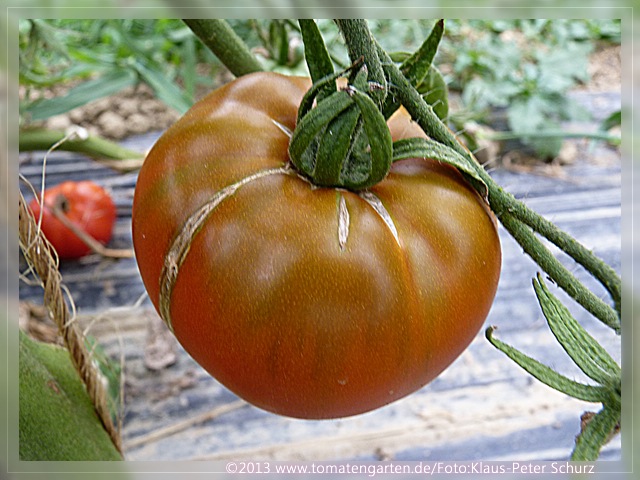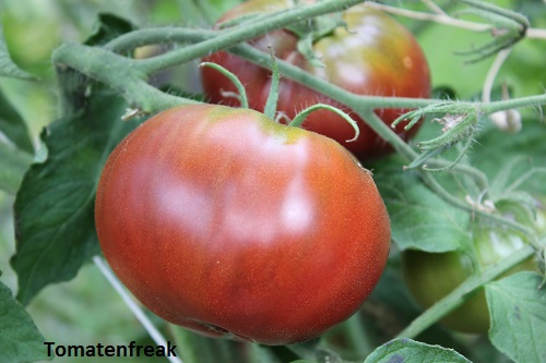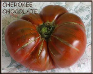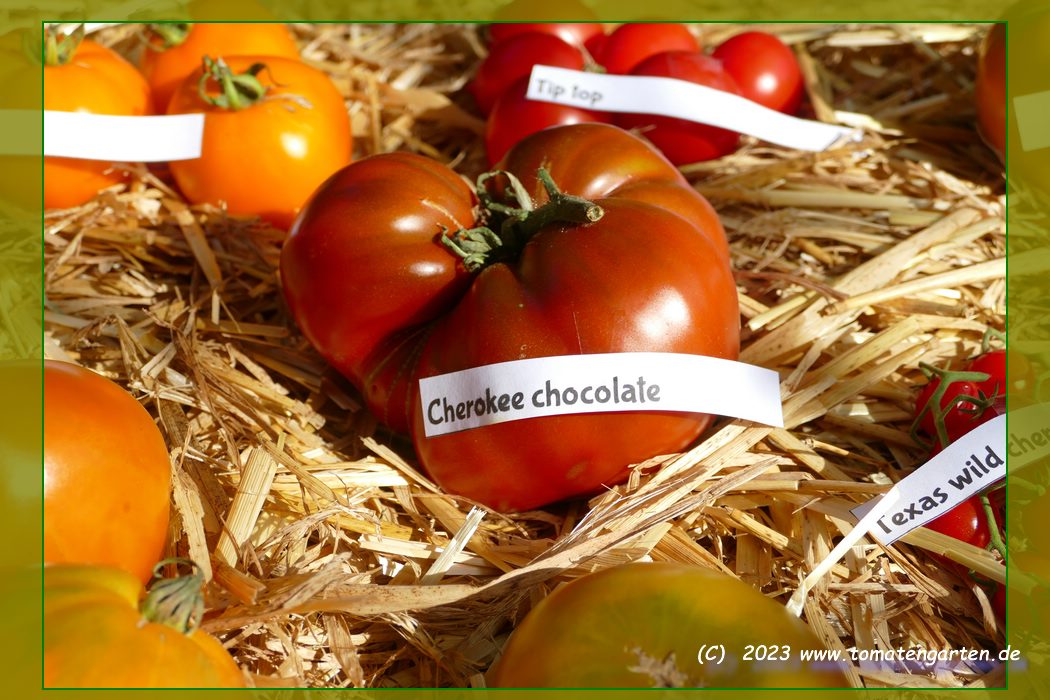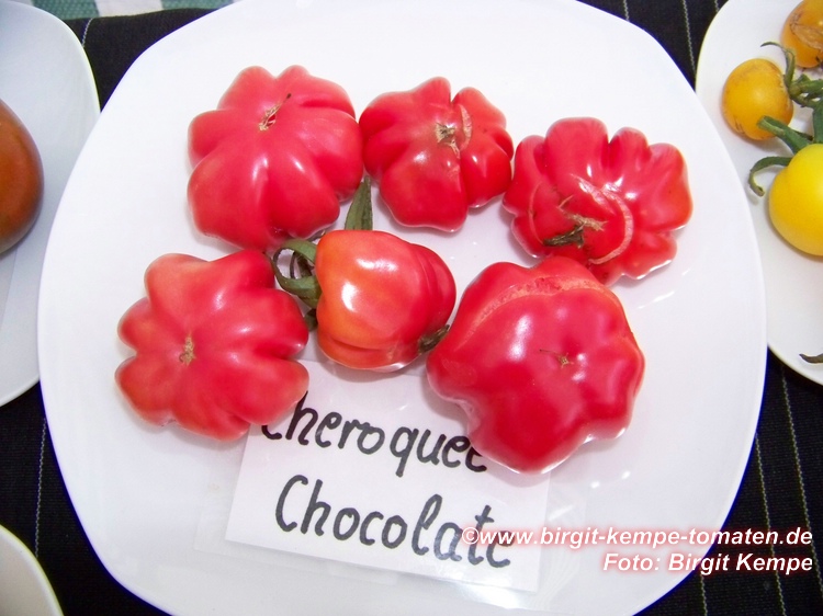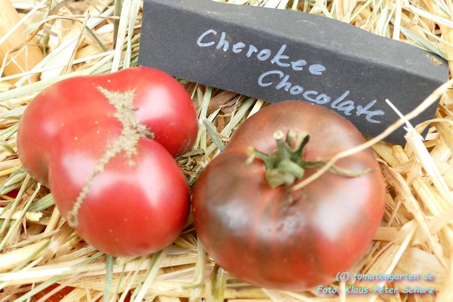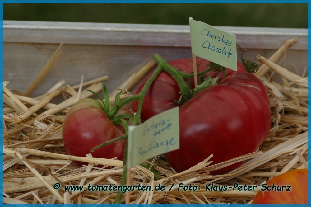 Cherokee Chocolate - sehr große (2,5 bis 3 m) Pflanze überraschend früher Erntebeginn (Ende Juli) enorm großer Ertrag sehr große, runde,kaum gerippte, tiefrote bis braunrote Früchte, aber teilweise auch kleinere Früchte wie eine Stabtomate größte geerntete Frucht: exakt 500 g sehr geschmackvoll mit Süße (Quelle: www.schoenetomaten.de)