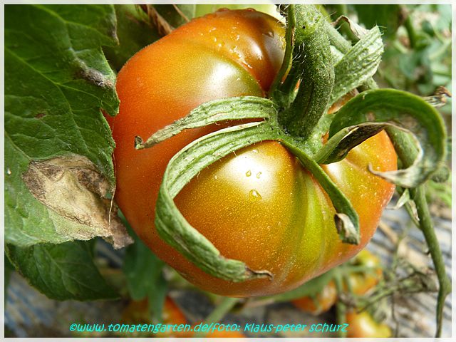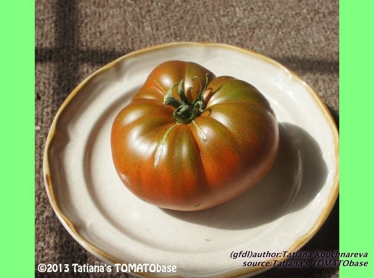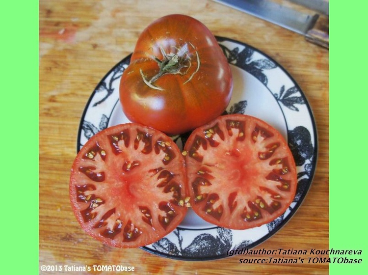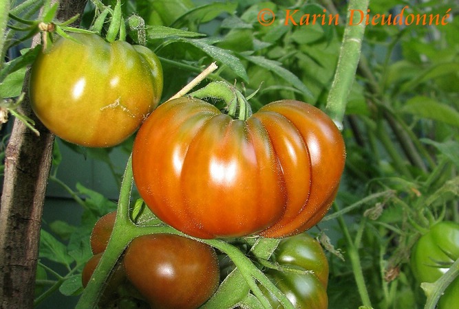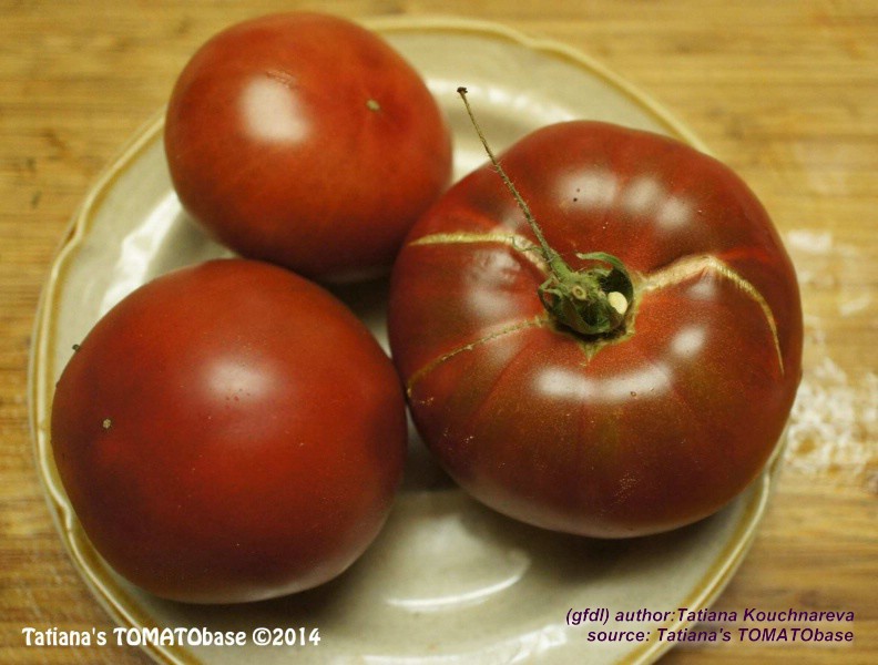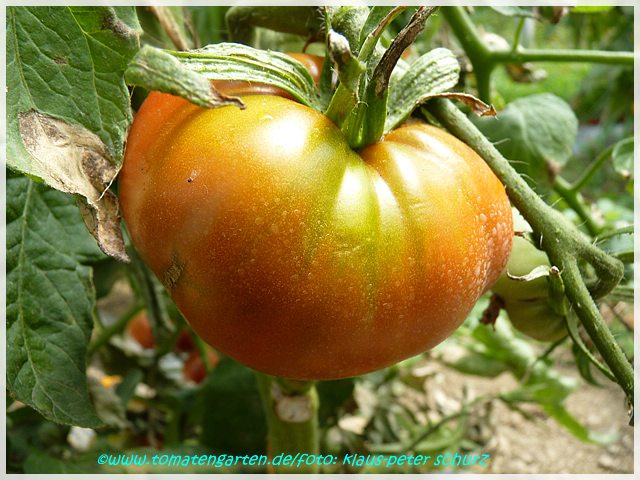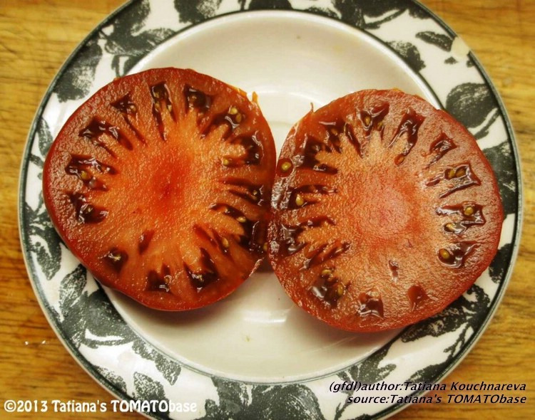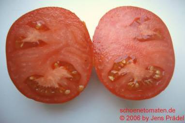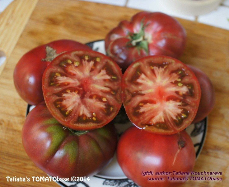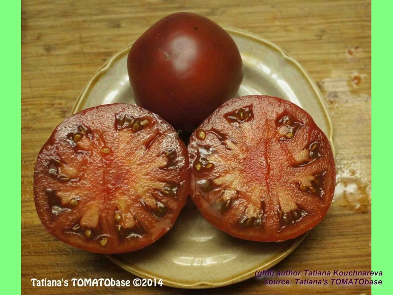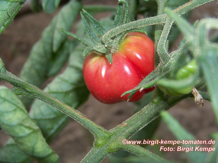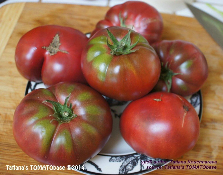 Cherokee Chocolate - sehr große (2,5 bis 3 m) Pflanze überraschend früher Erntebeginn (Ende Juli) enorm großer Ertrag sehr große, runde,kaum gerippte, tiefrote bis braunrote Früchte, aber teilweise auch kleinere Früchte wie eine Stabtomate größte geerntete Frucht: exakt 500 g sehr geschmackvoll mit Süße (Quelle: www.schoenetomaten.de)