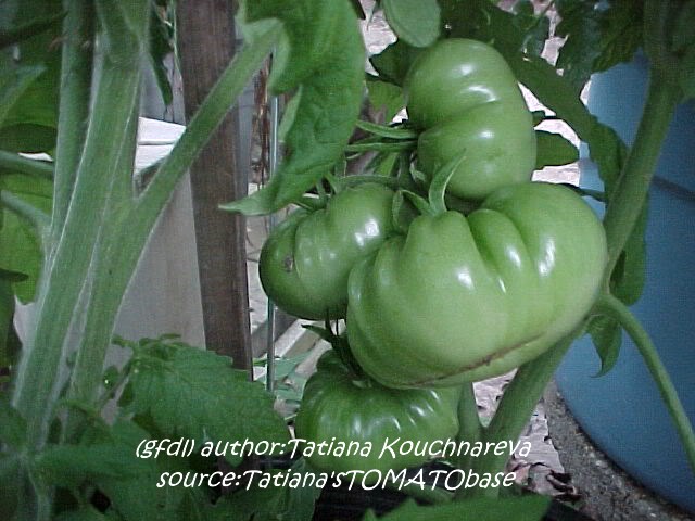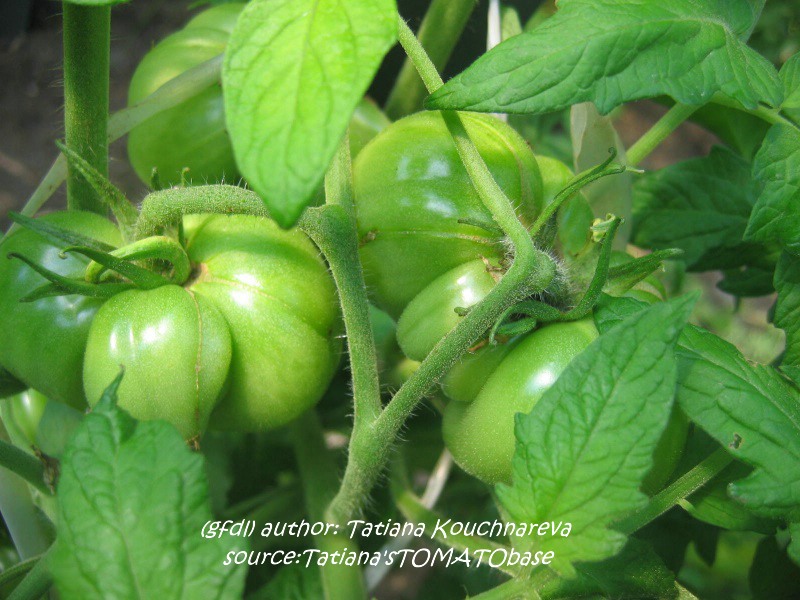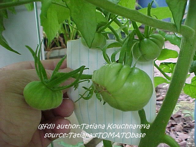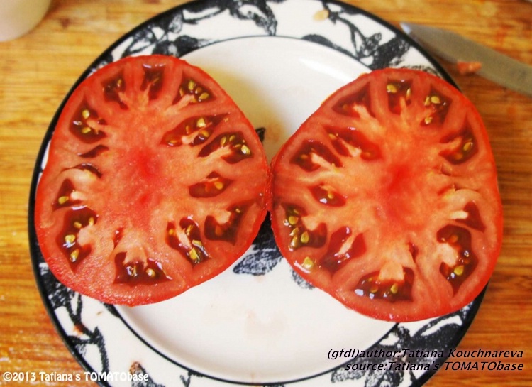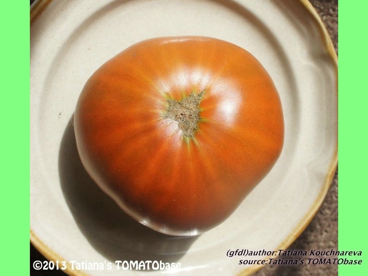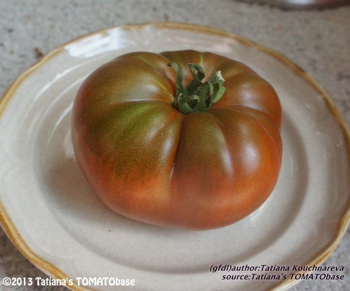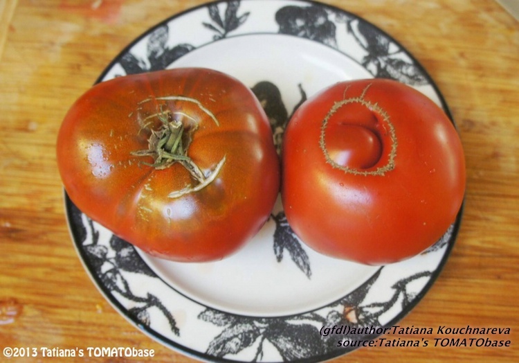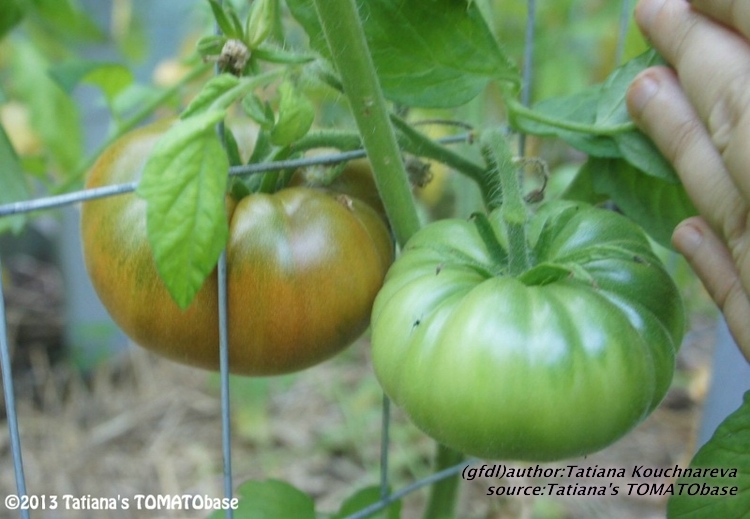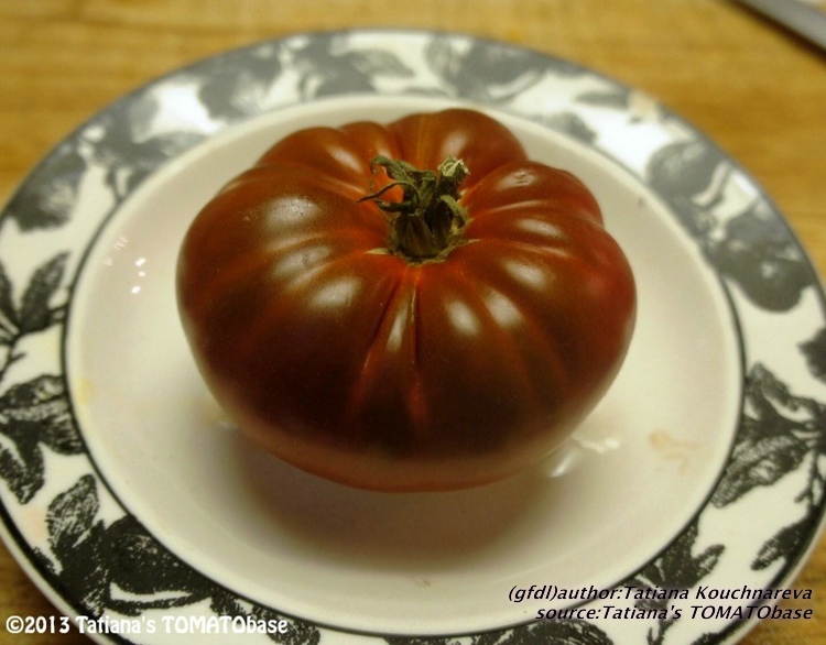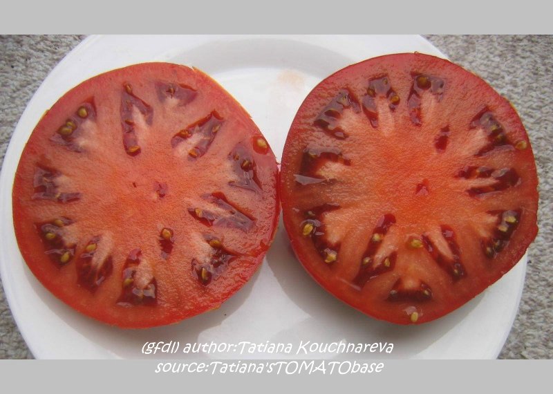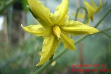 Cherokee Chocolate - sehr große (2,5 bis 3 m) Pflanze überraschend früher Erntebeginn (Ende Juli) enorm großer Ertrag sehr große, runde,kaum gerippte, tiefrote bis braunrote Früchte, aber teilweise auch kleinere Früchte wie eine Stabtomate größte geerntete Frucht: exakt 500 g sehr geschmackvoll mit Süße (Quelle: www.schoenetomaten.de)