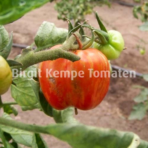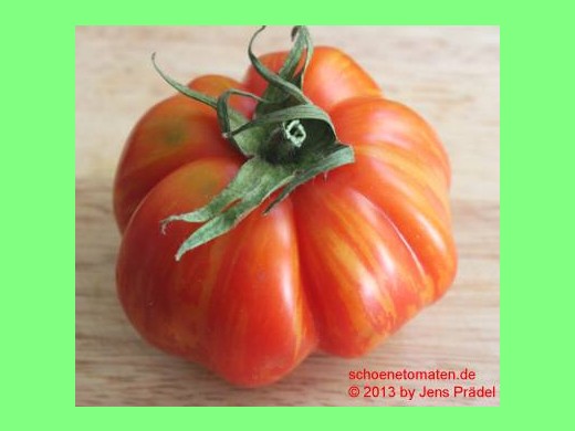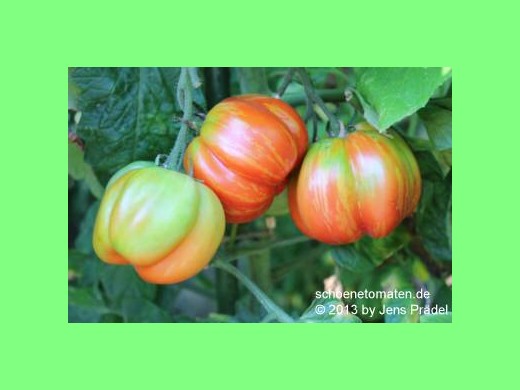 mittelgroße, blockpaprikaförmige (kleinere Früchte zapfenförmige), überwiegend stark gerippte, leuchtend rote Früchte mit orangegelben Streifen und oft noch grünlichen Flecken