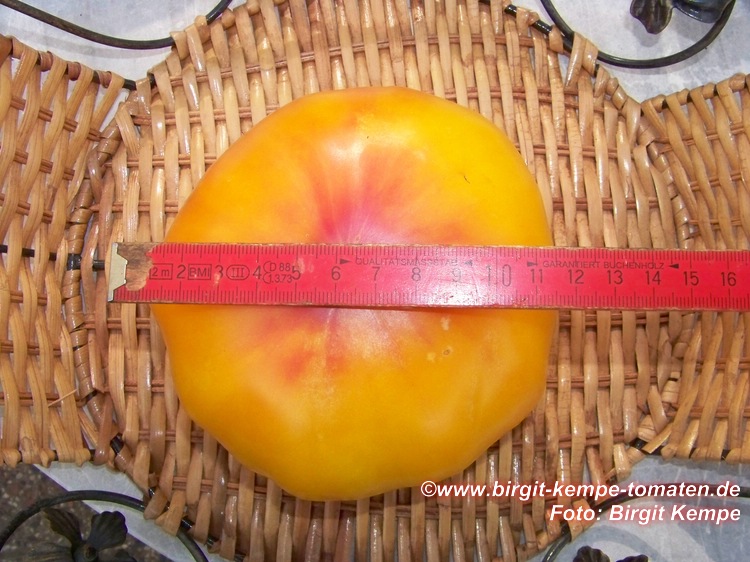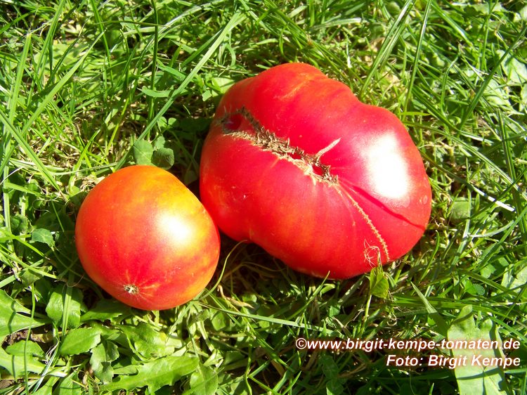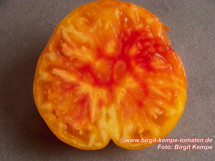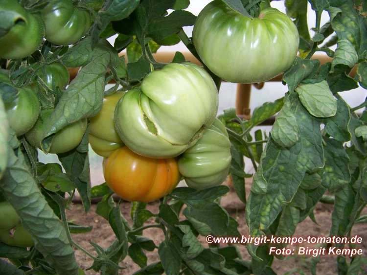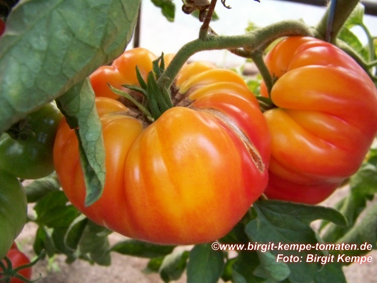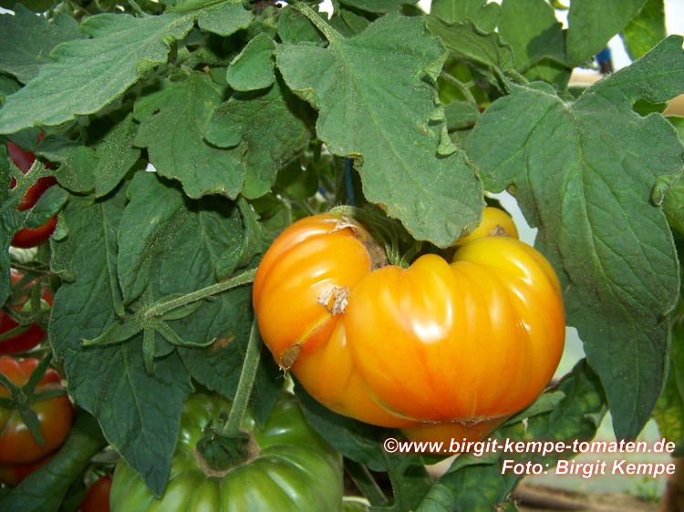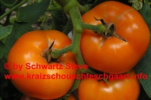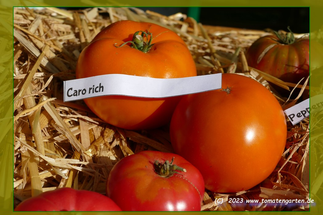 Caro Rich - sehr große Pflanze (bis 2,5 m) später Erntebeginn (Mitte August) sehr großer Ertrag mittelgroße, runde bis breitrunde, oben leicht gerippte, leuchtend orangerote Früchte ausgezeichneter Geschmack, bestimmt sehr gesund, da hoher Carotin-Gehalt saftig, sehr empfehlenswerte Sorte (Quelle: www.schoenetomaten.de)