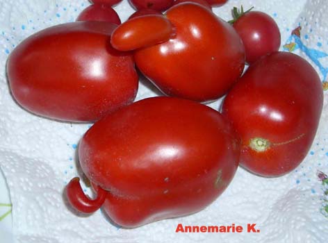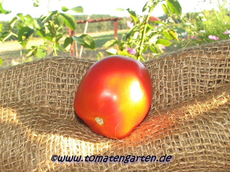 Cal-J - rote, eher eckige, grosse (ca. 5-7 cm) Früchte; Reife ab Mitte August; hoher Ertrag; stammt aus Amerika; gute Resistenz gegen Krautfäule. (Quelle: www.d-landsmann.de / Mit freundlicher Genehmigung des Autors)