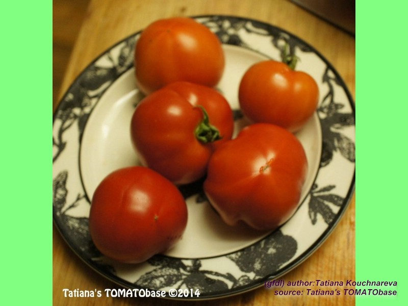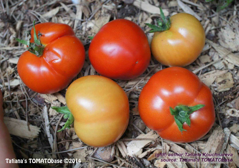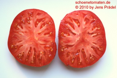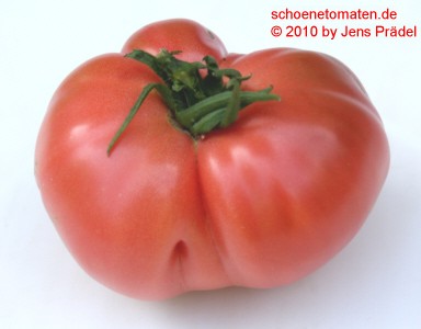 große, breitrunde, unregelmäßig gerippte, teilweise auch herzförmige, hellrote bis rosafarbene Früchte