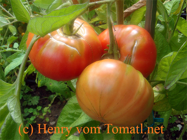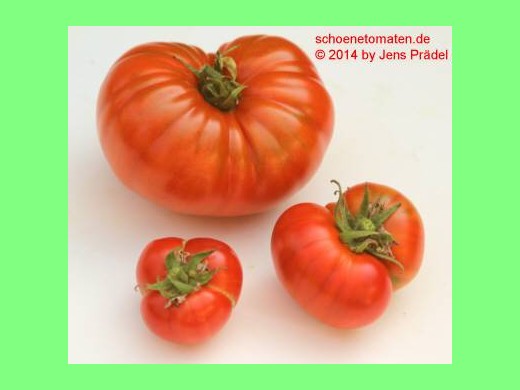 teilweise sehr große (ø 10 cm), breitrunde, rote Früchte