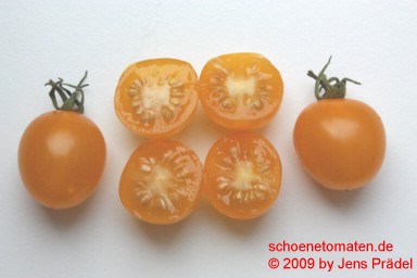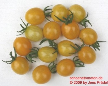 sehr kleine (ø 2 cm und ca. 8 bis 10 g), tropfenförmige, gelbe Früchte mit kleiner, stachelartiger Spitze