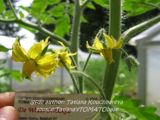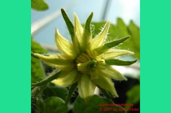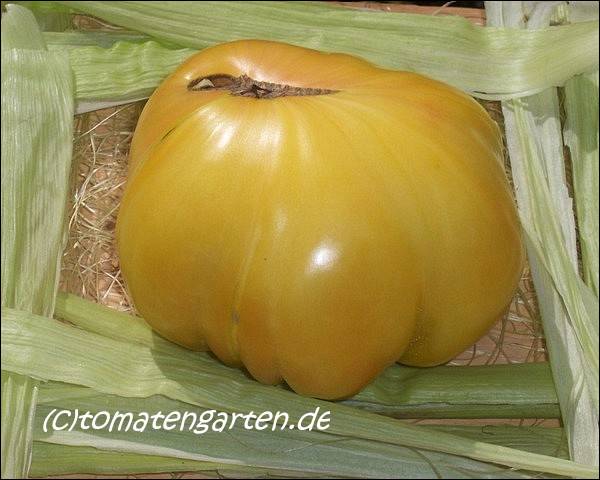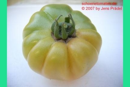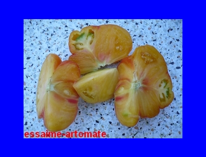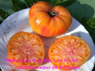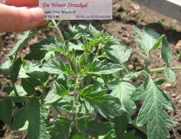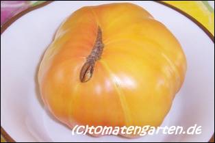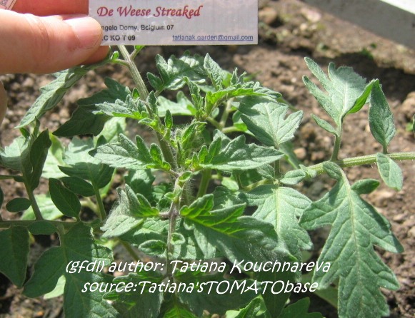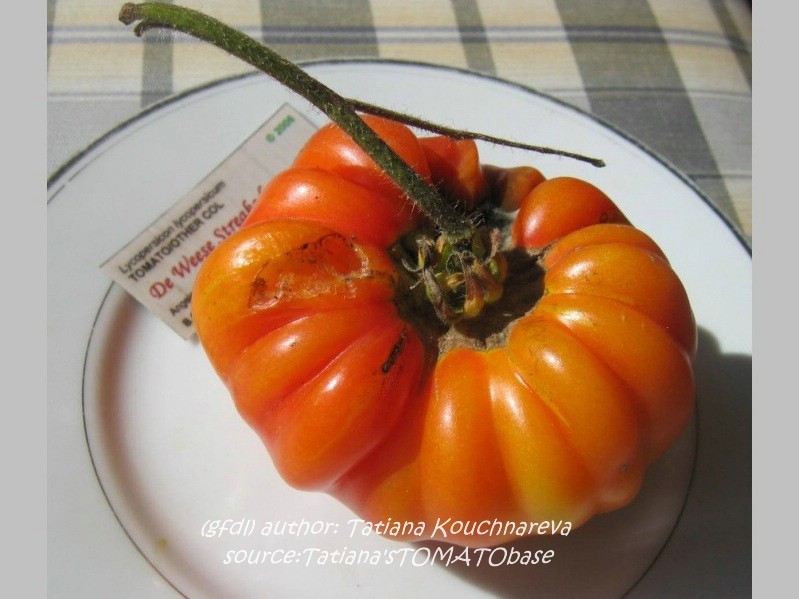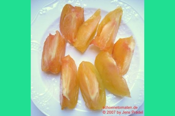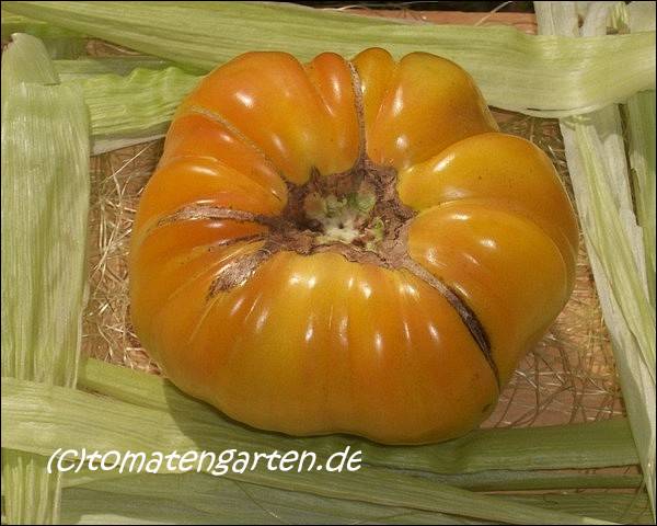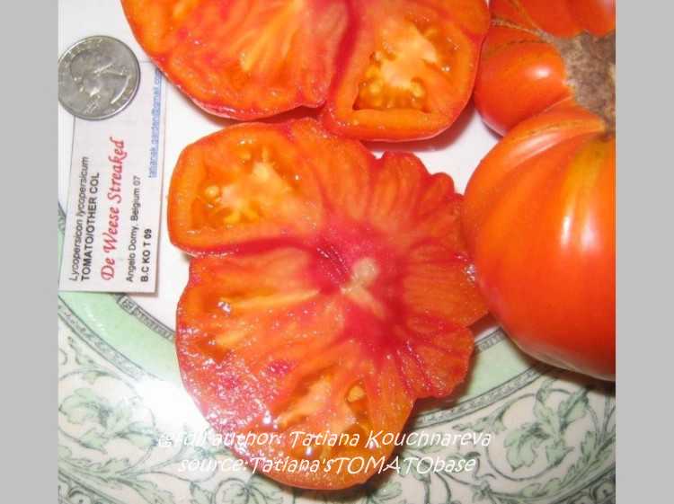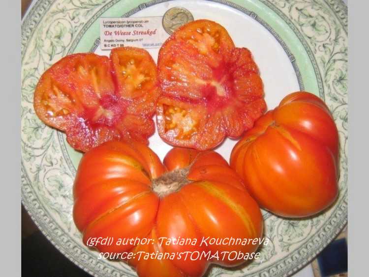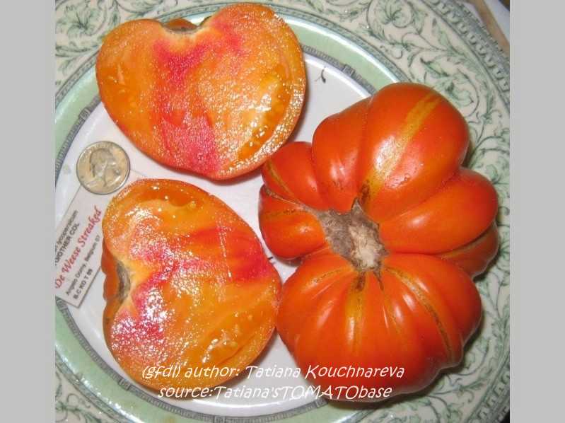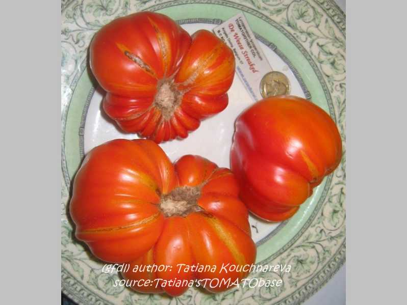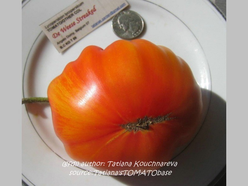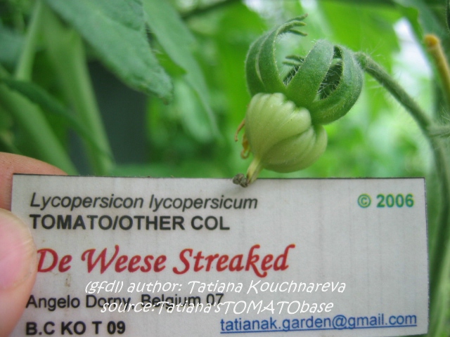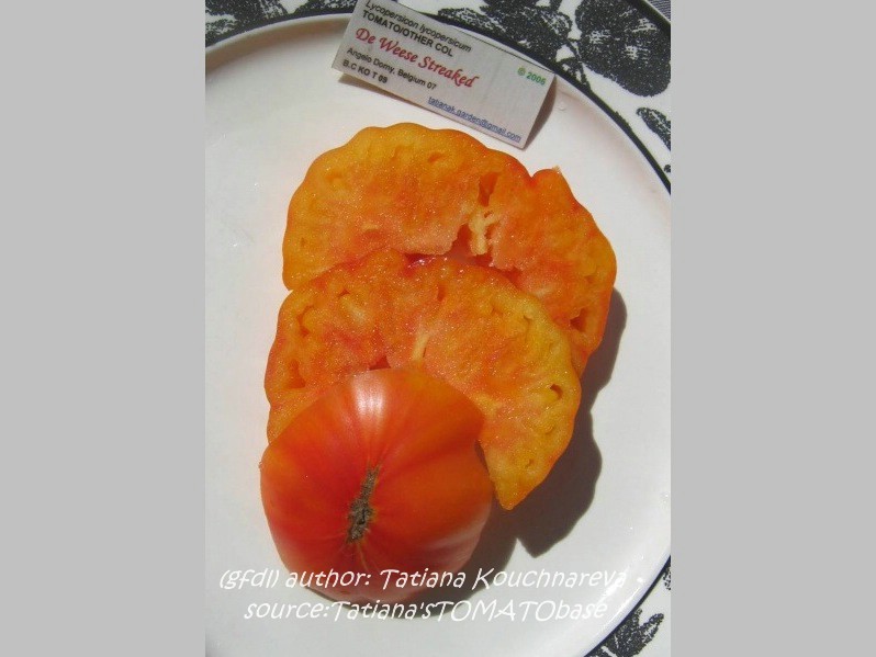 Deweese Streaked - mittelgroße Pflanze (bis 2 m) extrem später Erntebeginn (Anfang Oktober) mittlerer Ertrag große, runde, etwas gerippte, gelborange Früchte mit rötlichem Fruchtboden auch das Fruchtinnere ist rötlich durchzogen größte geerntete Frucht: 301 g sehr fruchtiger und saftiger Geschmack benötigt einen richtigen Tomatensommer, dann bestimmt eine Spitzensorte! (Quelle: www.schoenetomaten.de)