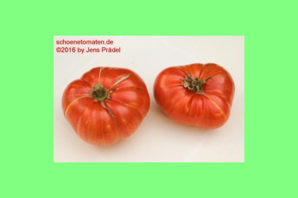 große (ø 7 bis 9 cm, 5 cm hoch), breitrunde, rot-orange gestreifte Früchte