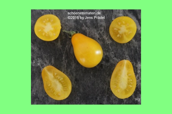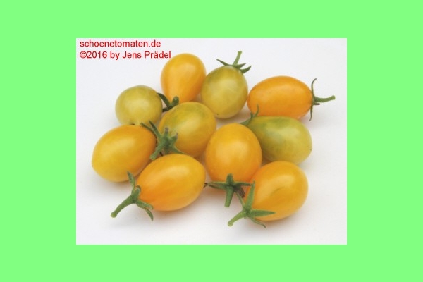 sehr kleine (ø 2 bis 2,8 cm, 2,5 bis 3,5 cm hoch), 8 bis 12 g schwere, birnenförmige oder eiförmige, gelbe Früchte an üppigen Fruchtständen