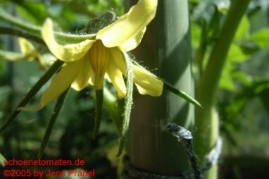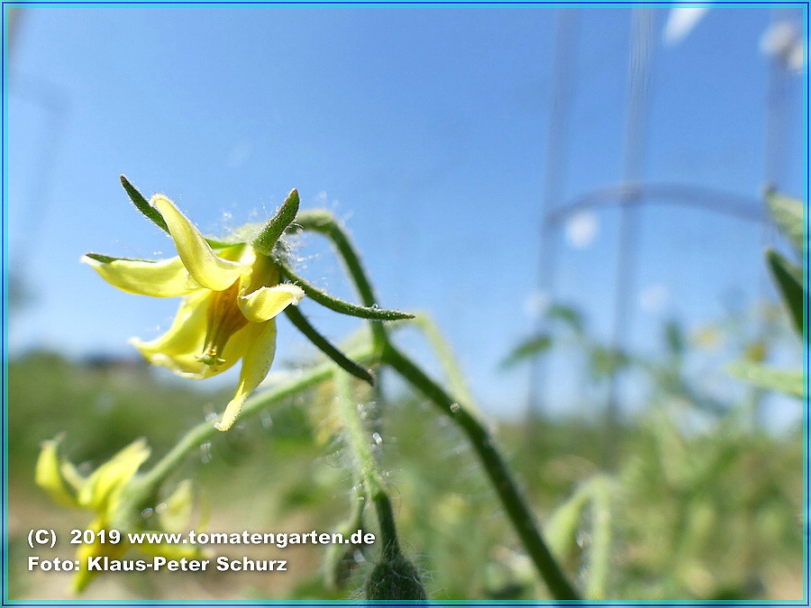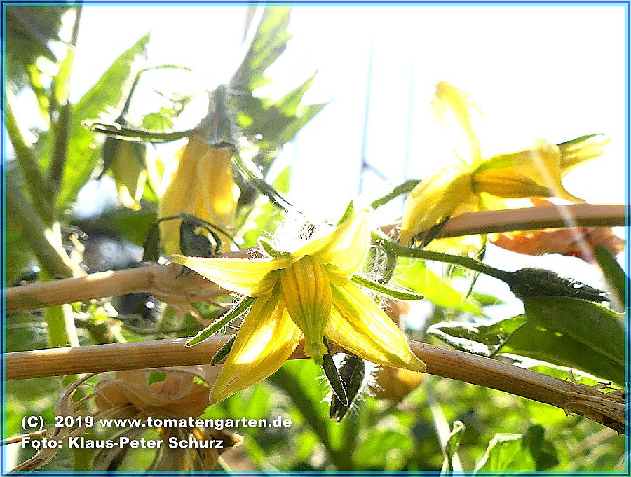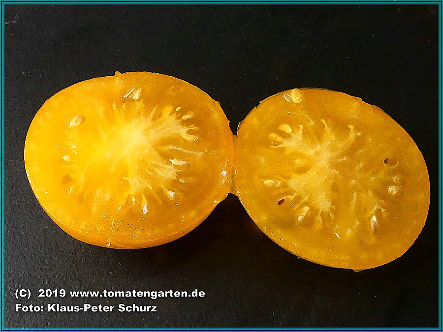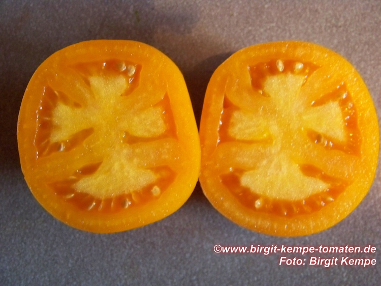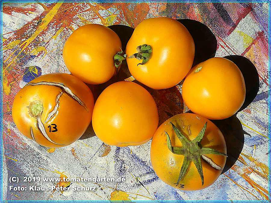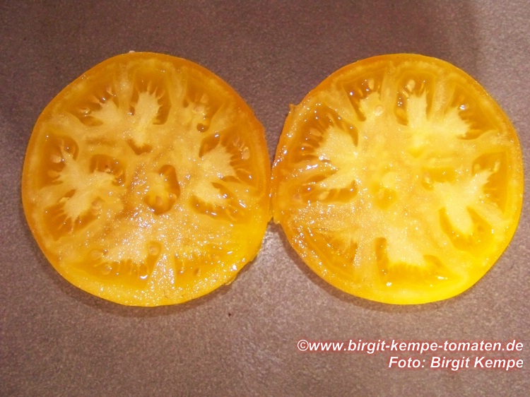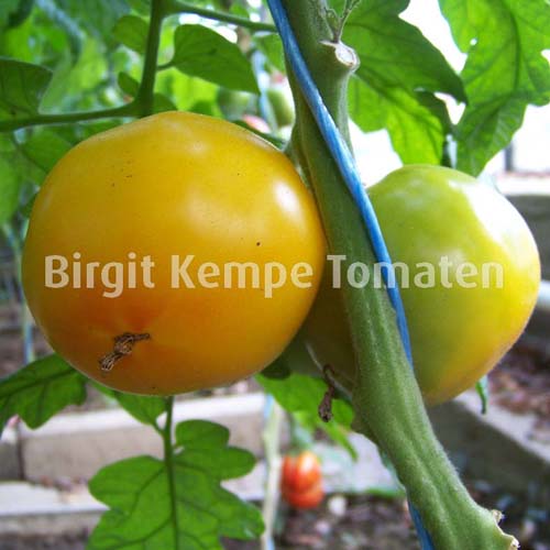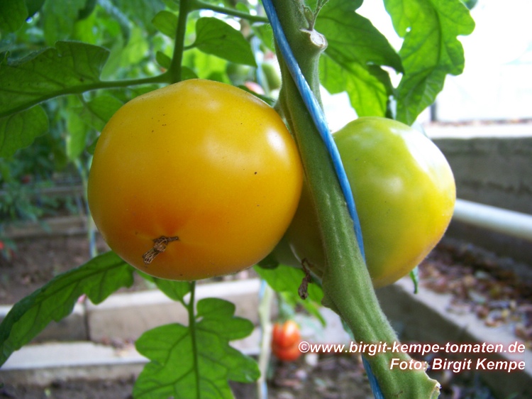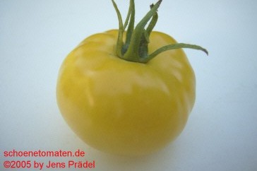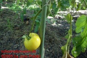 Delikatess gelb - sehr große Pflanze (bis 3 m) extrem später Erntebeginn (Mitte September) kein Massenträger große (150 bis 200 g), runde, leuchtend gelbe, gleichmäßige (Form und Farbe betreffend) Früchte ausgezeichnet milder Geschmack, saftig, festes Fruchtfleisch sehr gut haltbar offenbar recht tolerant gegen Braun- und Krautfäule (Quelle: www.schoenetomaten.de