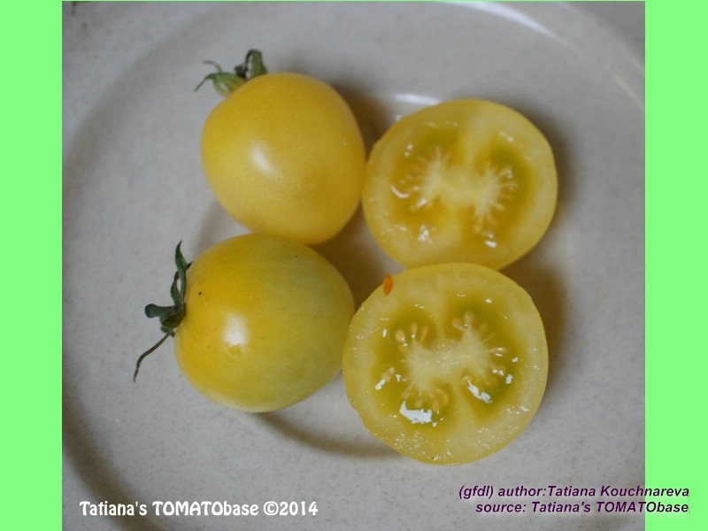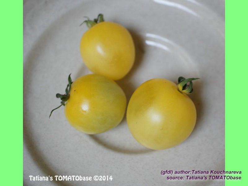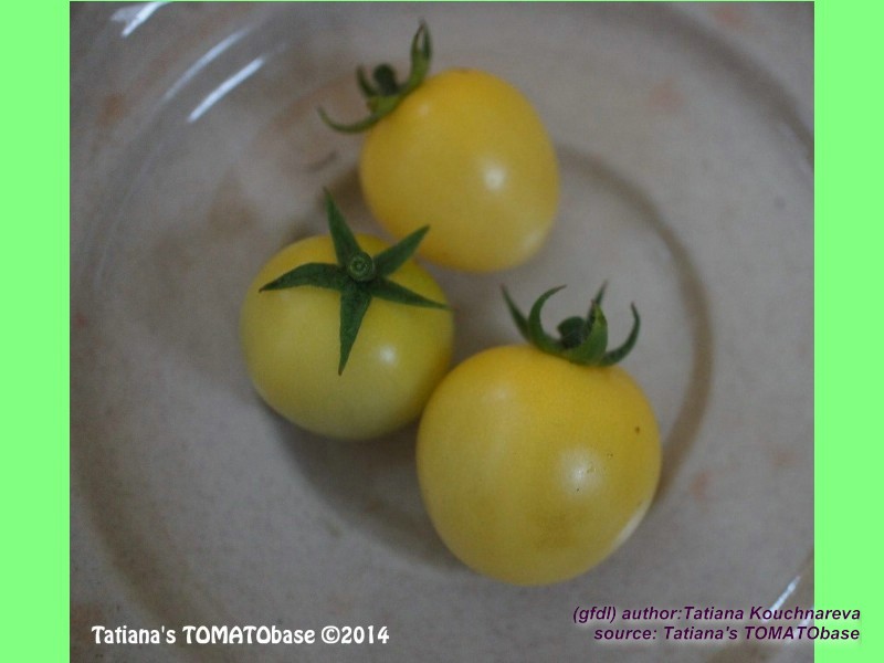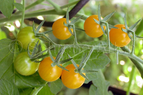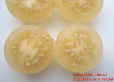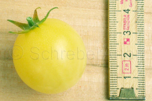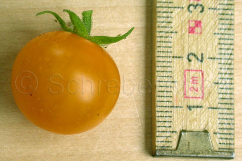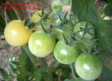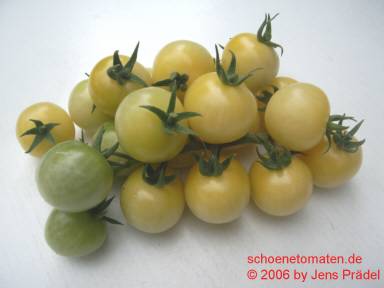 Dr. Carolyn - blassgelbe runde kleine (ca. 2-3 cm) Kirschtomate mit säuerlichem Geschmack; Reife ab Mitte August, Buschtomate. (Quelle: www.d-landsmann.de / Mit freundlicher Genehmigung des Autors)
